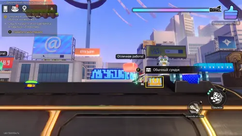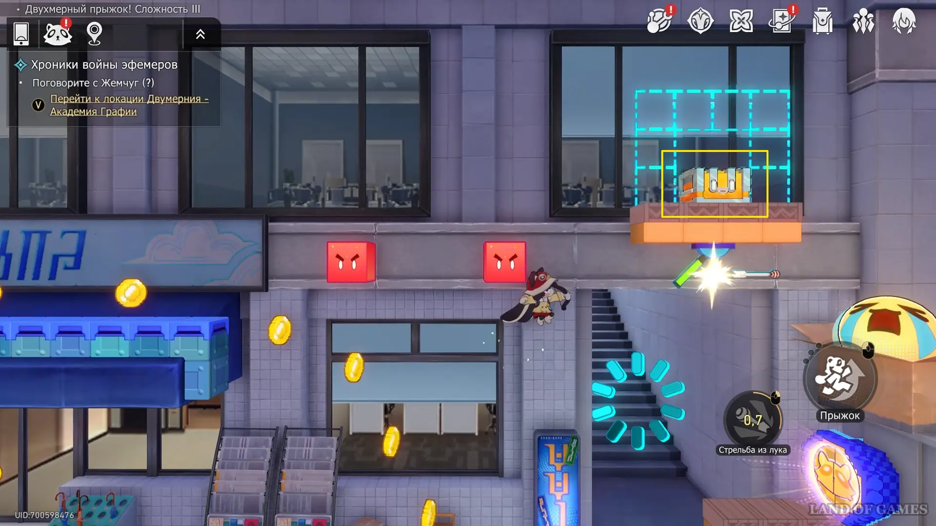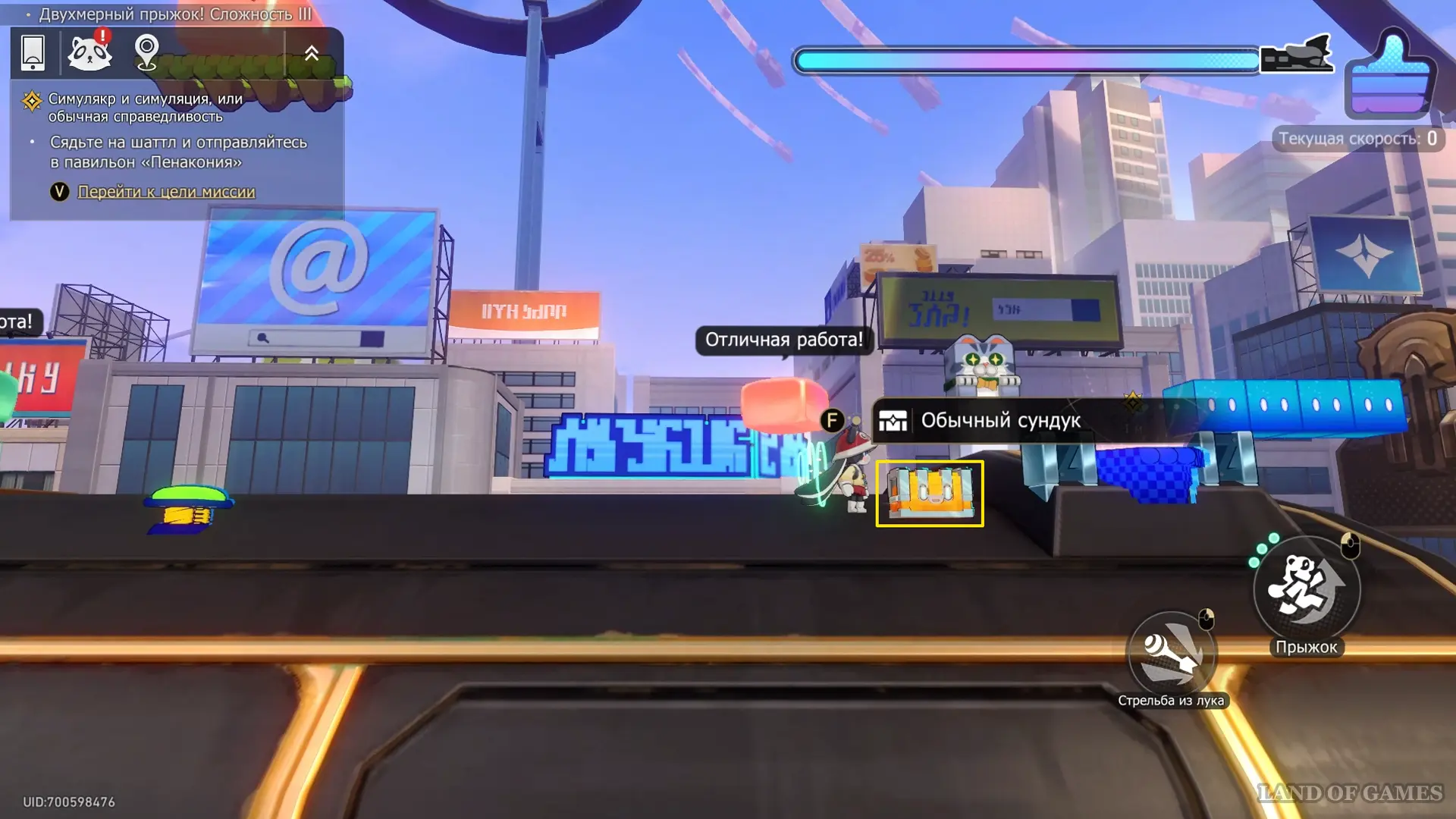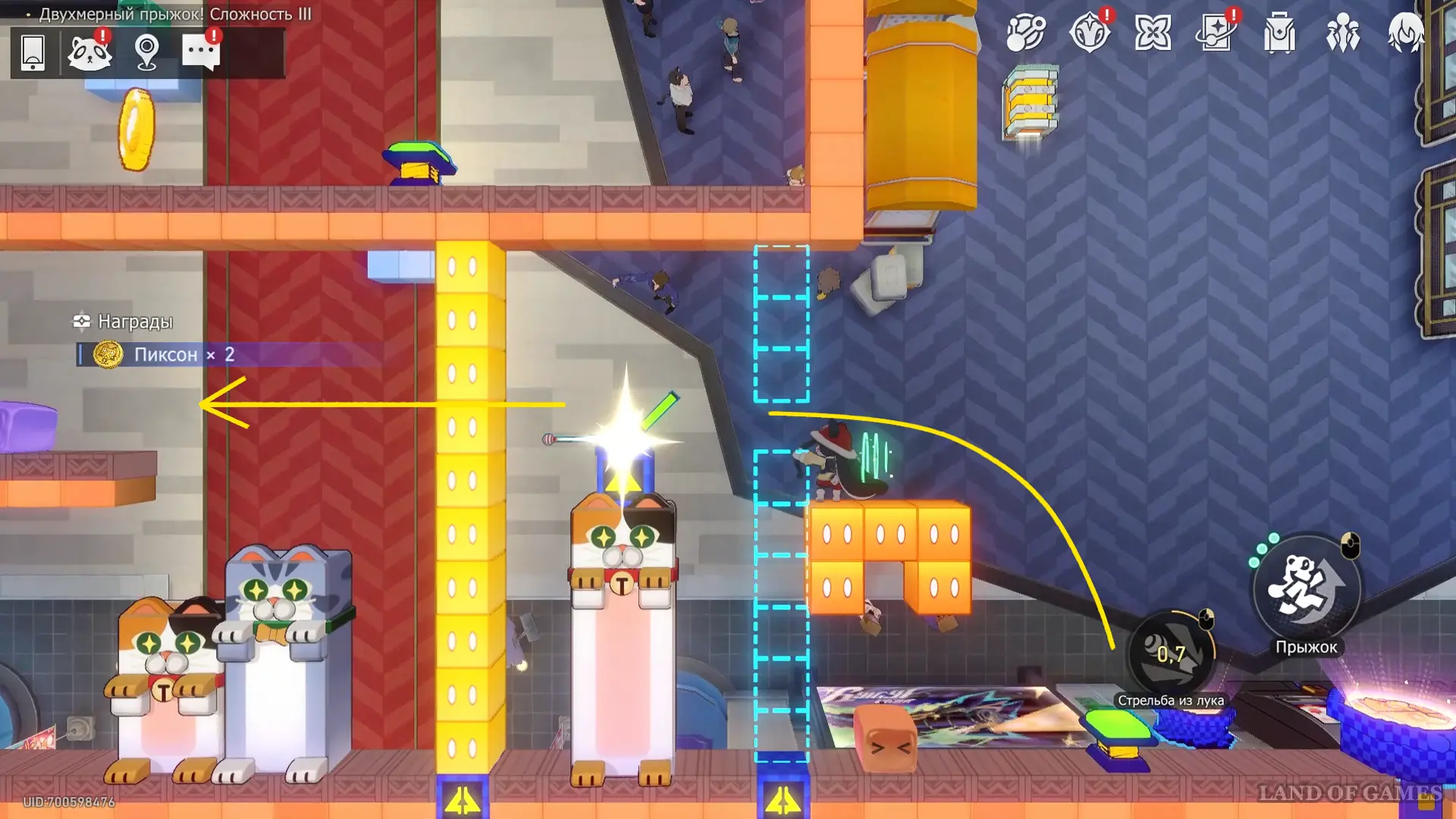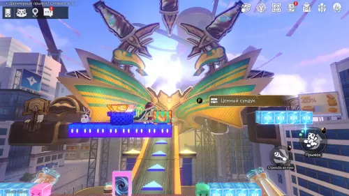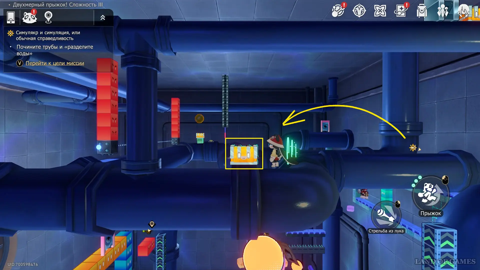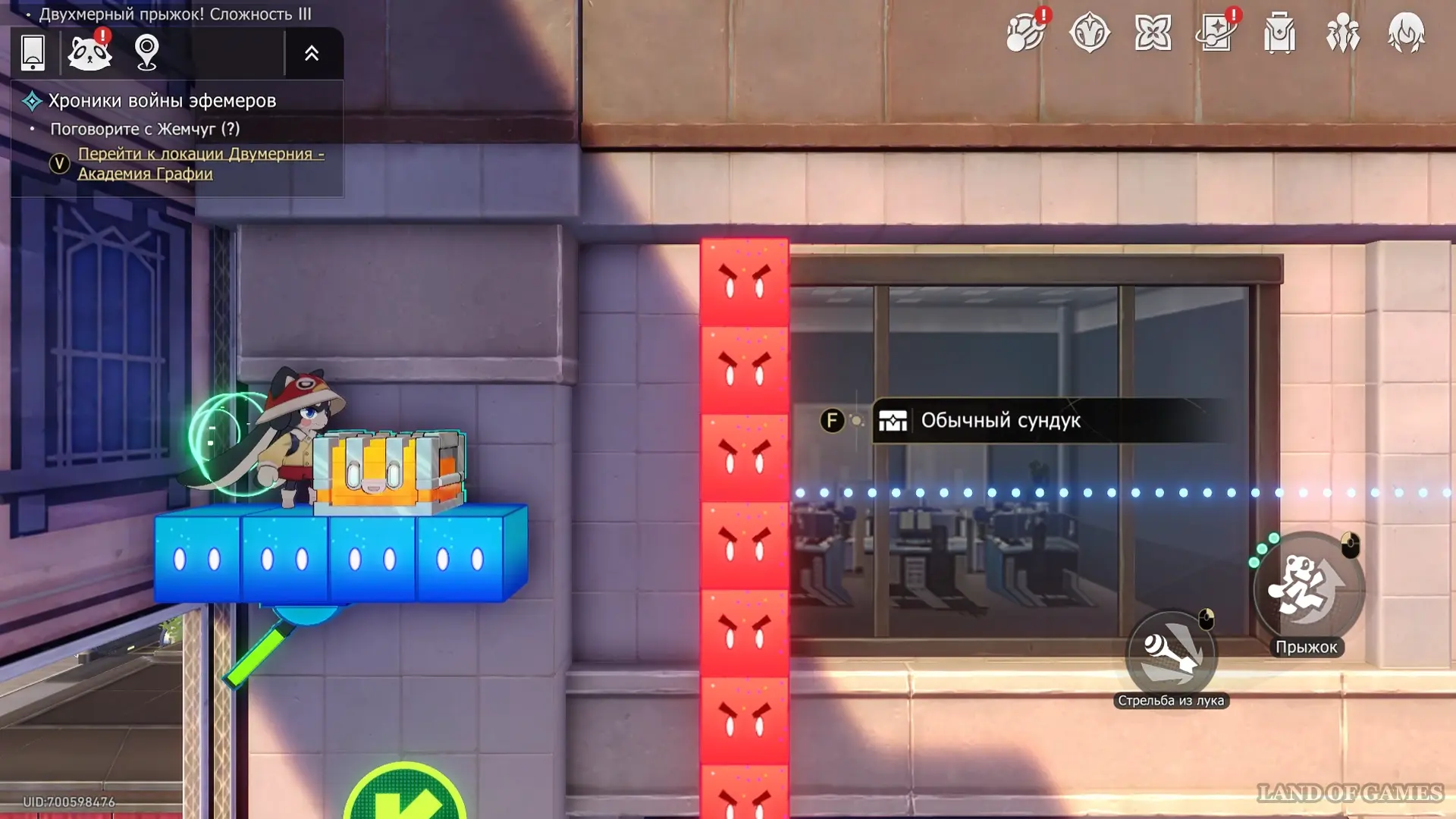 На третьей площадке подбегите к кнопке под синими блоками слева и быстро нажимайте ее в прыжке, чтобы снизить ХП Коколии и завершить испытание «Легенды о пушистых героях». Затем поднимитесь через открывшийся сверху проход и заберите ценный сундучок.