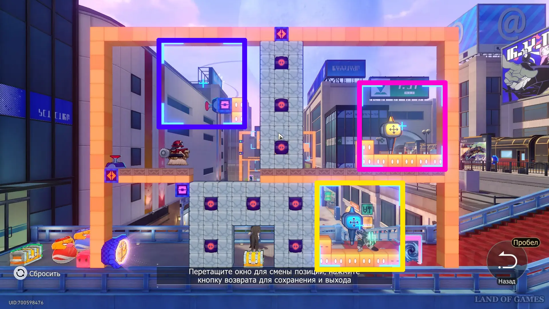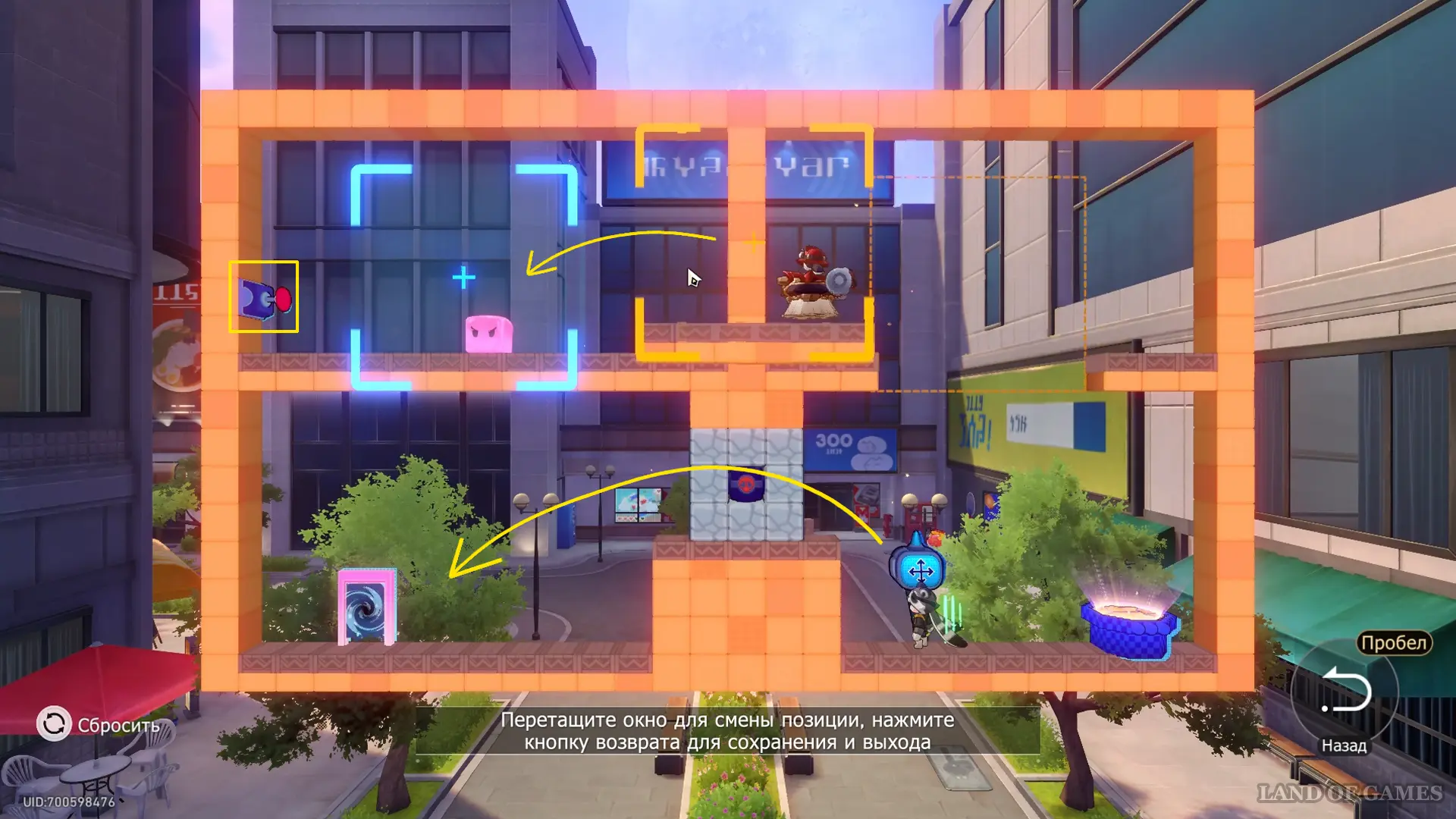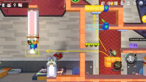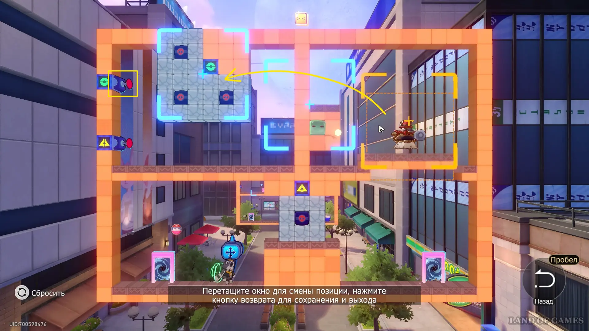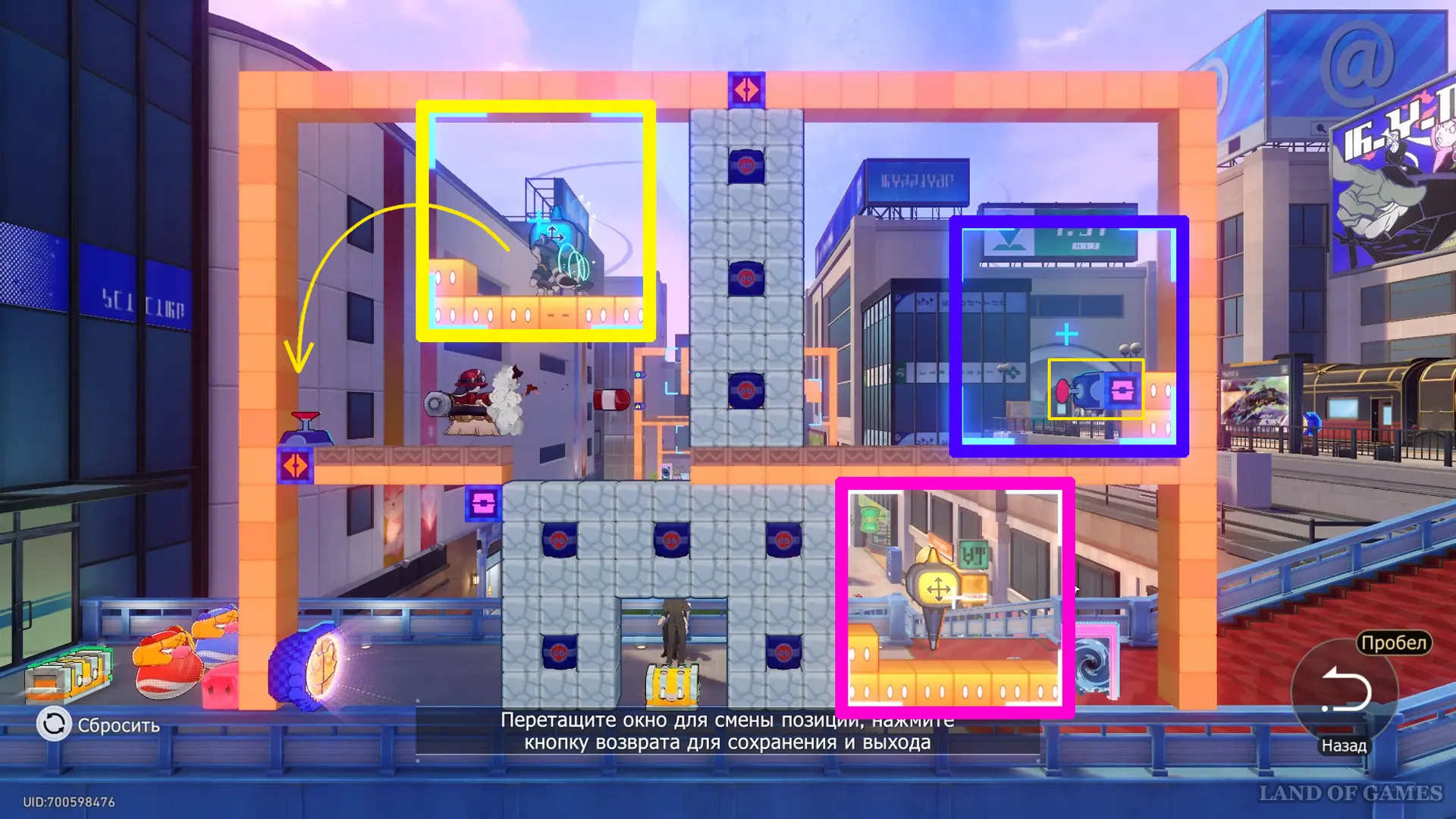 Во 2-й зоне сначала переместите ячейку с мобом влево и дождитесь активации зеленой кнопки. Затем верните Пом-помощника на правую ячейку, блок с зеленым эфемером — на место предыдущего. Как только ракета ударит по желтой кнопке, вы сможете пройти к следующему порталу.