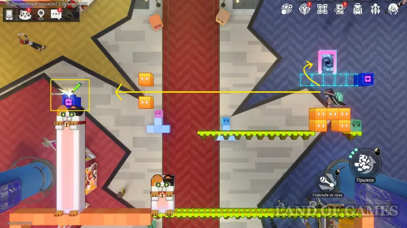 Оказавшись внутри испытания, сразу двигайтесь влево. Через зазоры между плитками выстрелами активируйте рычаги на головах кошек и поднимайтесь в верхнюю часть уровня. Чтобы попасть в портал, встаньте на оранжевую платформу под ним и выстрелите влево в нужный момент — когда кошка окажется в положении, при котором стрела заденет рычаг.