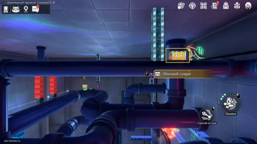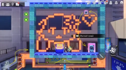 Войдя в трубу и оказавшись на 2-й карте, двигайтесь влево, запрыгните на любую фиолетовую платформу и доберитесь до площадки в левом верхнем углу зоны — там находится следующий сундук.