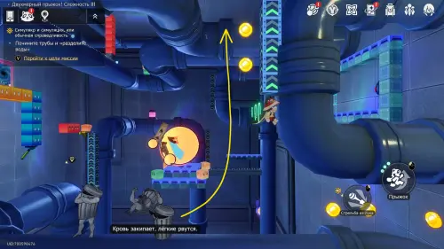 Оказавшись на карте, двигайтесь вправо и дождитесь платформы, появляющейся из отверстия. Встаньте на нее и используйте две кнопки, чтобы поднимать боковые панели и защищаться от ракет Пом-помощниц, как показано на видео ниже. Ваша задача — безопасно подняться на верхний ярус уровня, избегая снарядов железяк, стоящих на выступах (в противном случае вас отбросит в самый низ). Добравшись до вершины, спрыгните с платформы и направляйтесь в трубу справа, по пути опустошив обычный ларец.