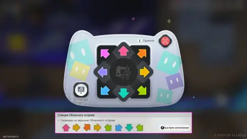 Спуститесь вниз и активируйте игрушечный инструмент. Введите комбинацию стрелок, показанную выше, чтобы корректно исполнить «Серенаду на вершине Облачного острова»: вверх, вправо, вверх-вправо, вправо, вниз-вправо, вниз-влево, вниз, вниз-вправо.