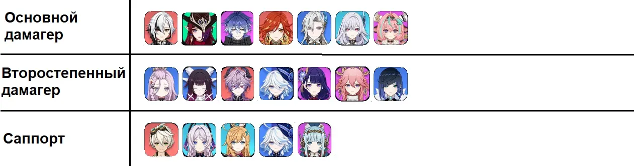 | Мейн-ДД | Саб-ДД | Саб-ДД/Поддержка | Поддержка |