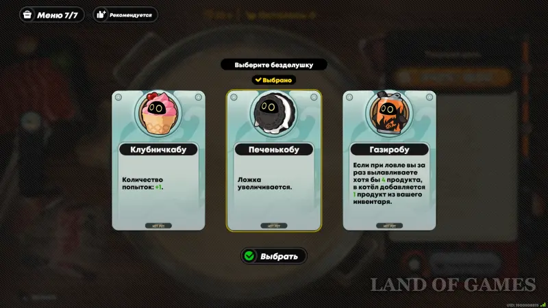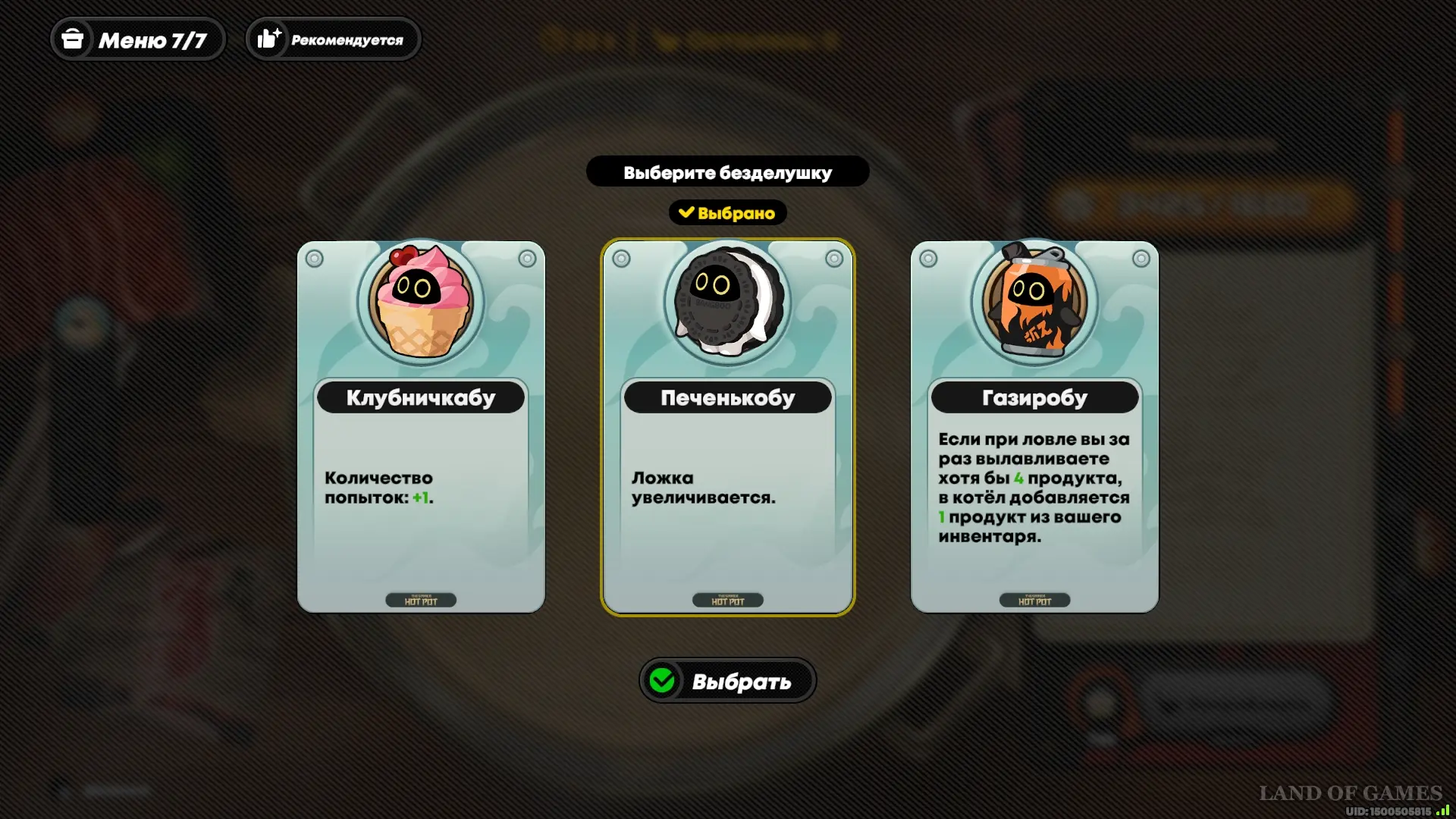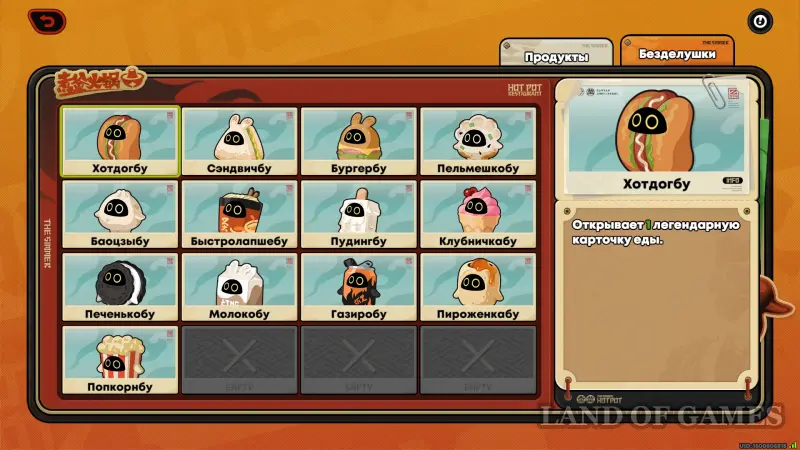Вы также откроете безделушки — это маленькие сувениры в форме банбу, которые дают различные усиления и улучшения. На этом и следующих уровнях советуем выбирать Печенькобу, Клубничкабу и Хотдогбу — это наиболее универсальные карты, которые позволят быстро получить легендарные продукты и получить больше очков за счет увеличенной ложки и большего количества попыток.