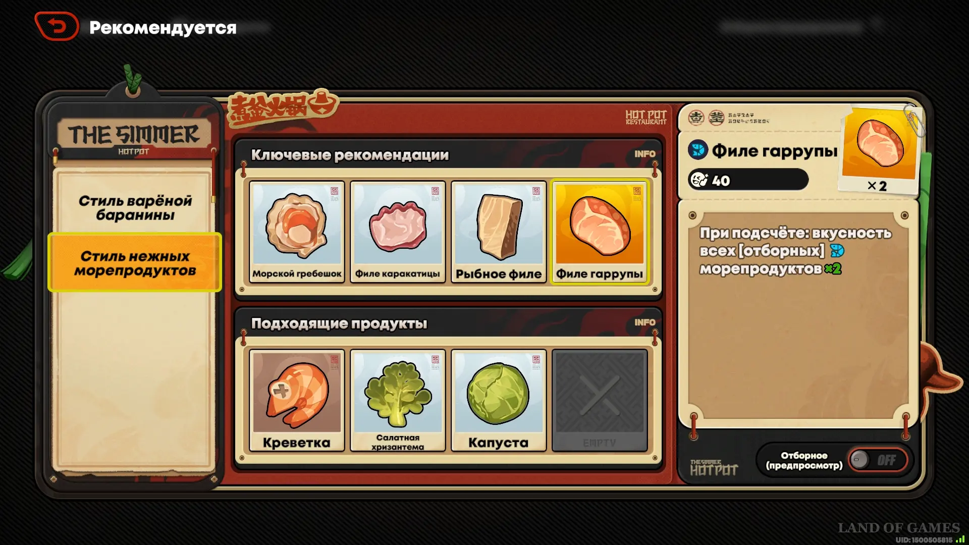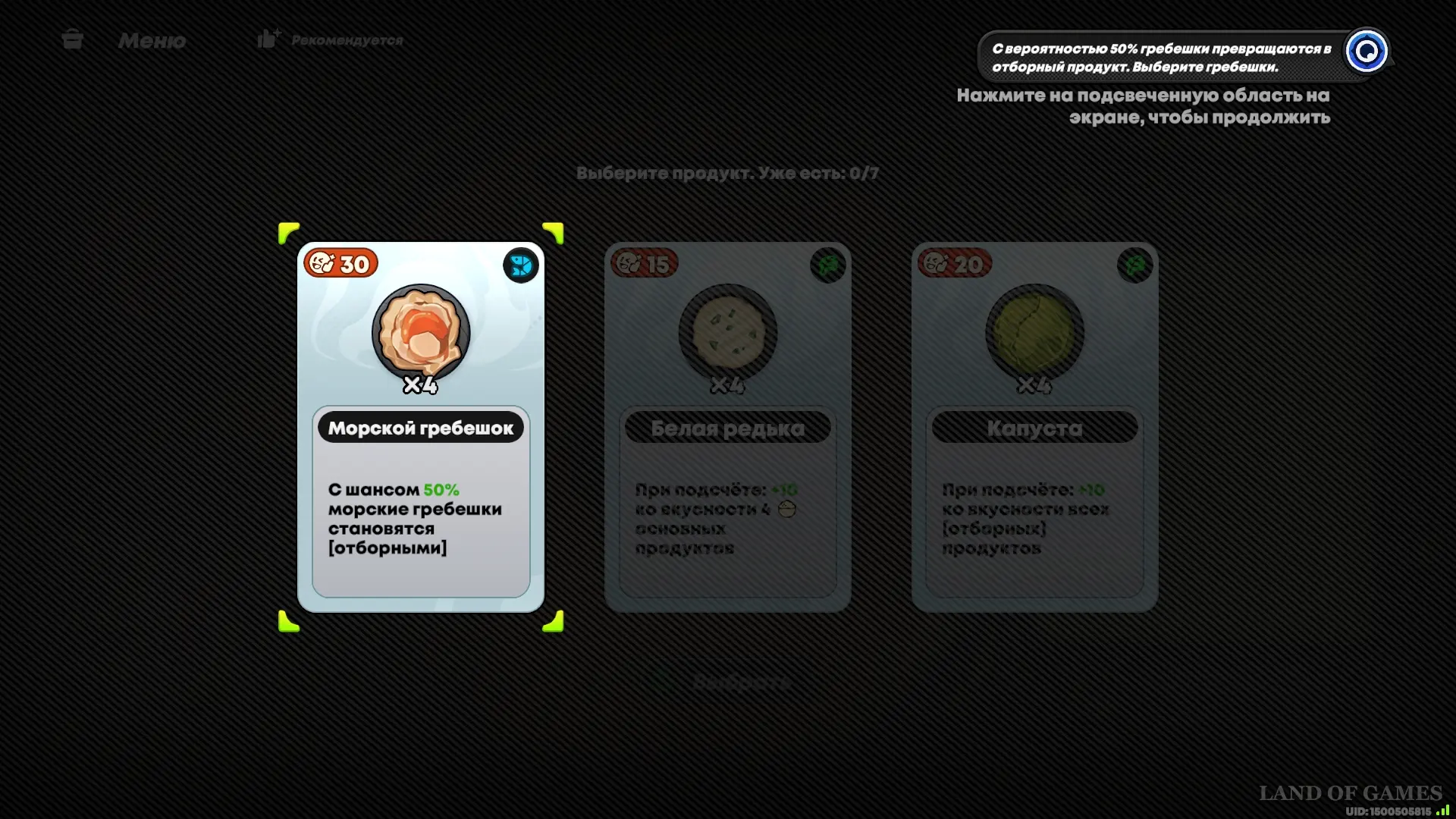 Ваша стратегия на этом уровне будет строиться на поиске и баффах отборных морепродуктов. Для начала достаточно получить морские гребешки и креветки — они идеально сочетаются и позволяют сразу получить большое количество очков.