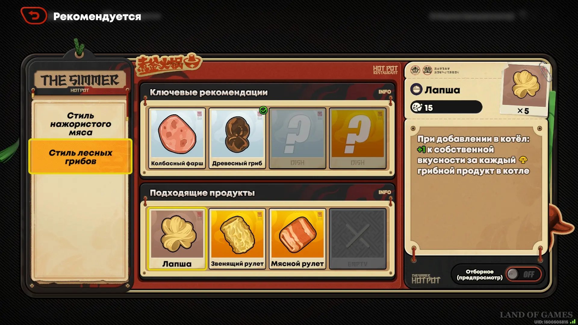Лучшей комбинацией для начала станут лапша и древесный гриб, баффающие друг друга. Затем стоит нацелиться на получение эноки.
