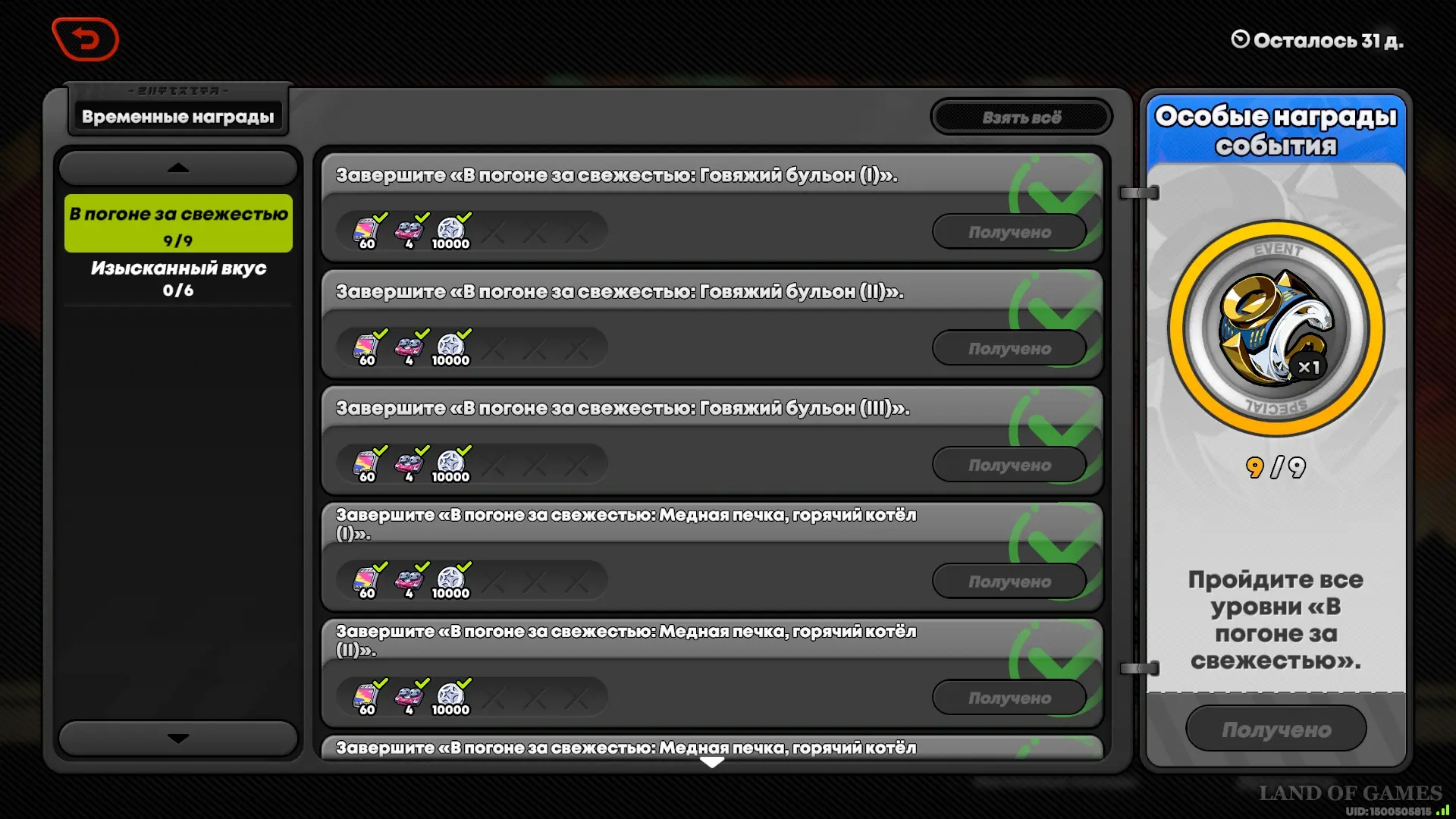 Проходя сюжетные уровни «В погоне за свежестью» и режим «Изысканный вкус», вы будете повышать уровень прогресса поиска вкусов. Пройдя все уровни, вы получите 200 полихромов, 900 кредитов Интернота, 105 тысяч денни, 9 журналов эксперта и 40 исходных чипов. После прохождения всех сюжетных глав события вы получите титул «Приглашенный посетитель заведений».