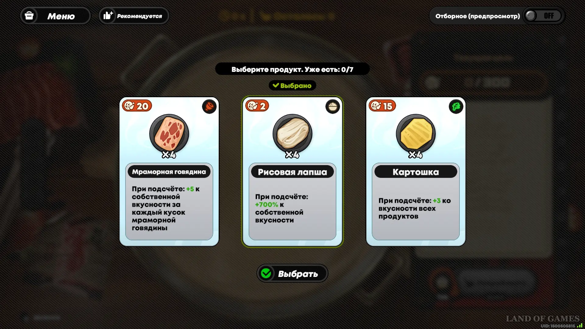 Постарайтесь в первых же раундах выбрать рисовую лапшу. При подсчете она получает огромный показатель вкусности, что позволит быстро набрать очки. С ней отлично сочетаются морковка и лазурный салат — их баффы в первую очередь действуют именно на лапшу.