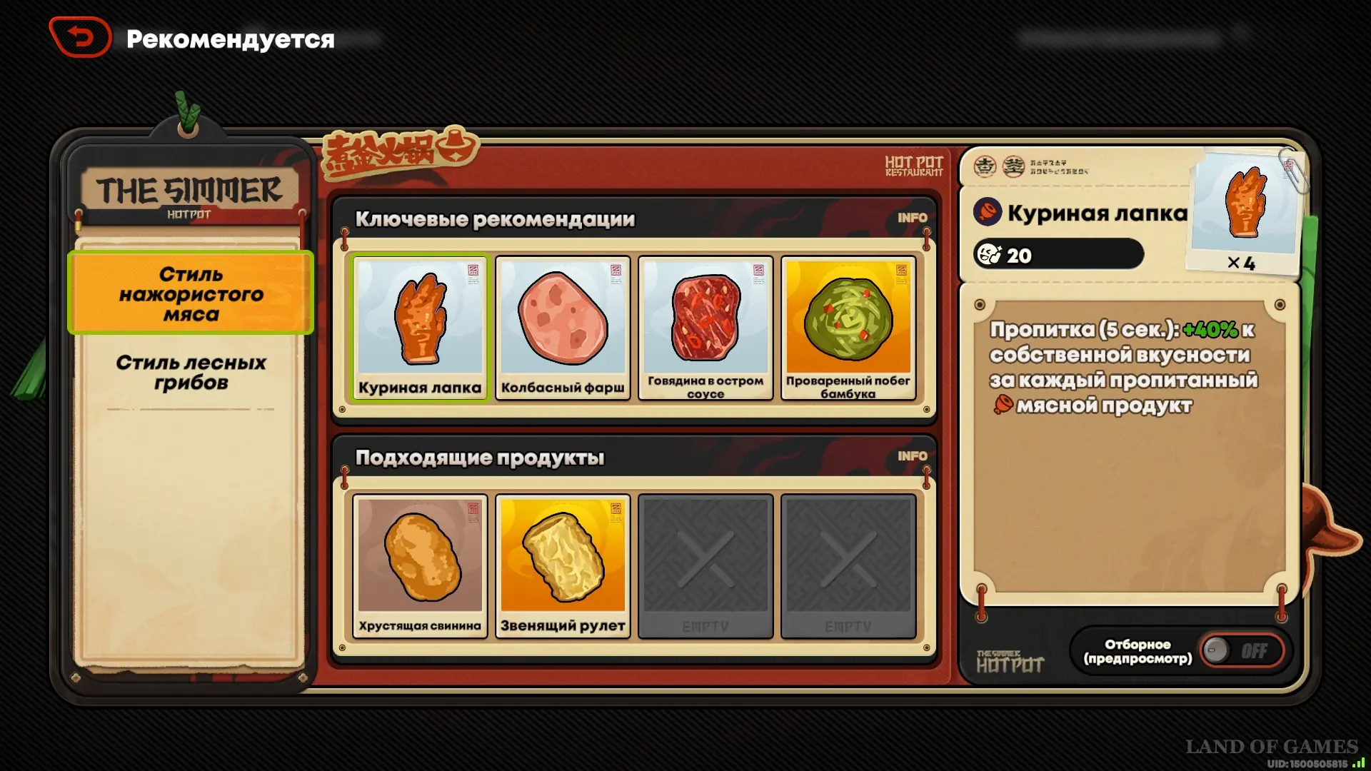 На этот раз можете выбрать любой понравившийся стиль с пропиткой, однако стиль нажористого мяса будет эффективнее, поскольку важная для стиля лесных грибов карточка — эноки — разблокируется только после завершения уровня.