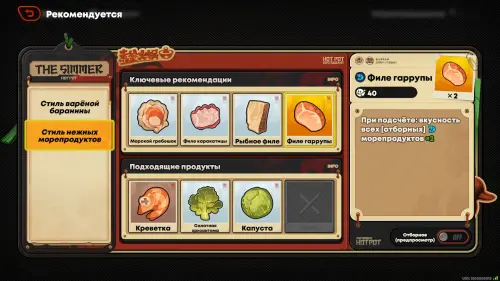 После можно будет добавить пару мясных продуктов. Тогда обязательной становится крафтовая фрикаделька — если ловить ее вместе с мясом, вкусность продуктов значительно увеличится.