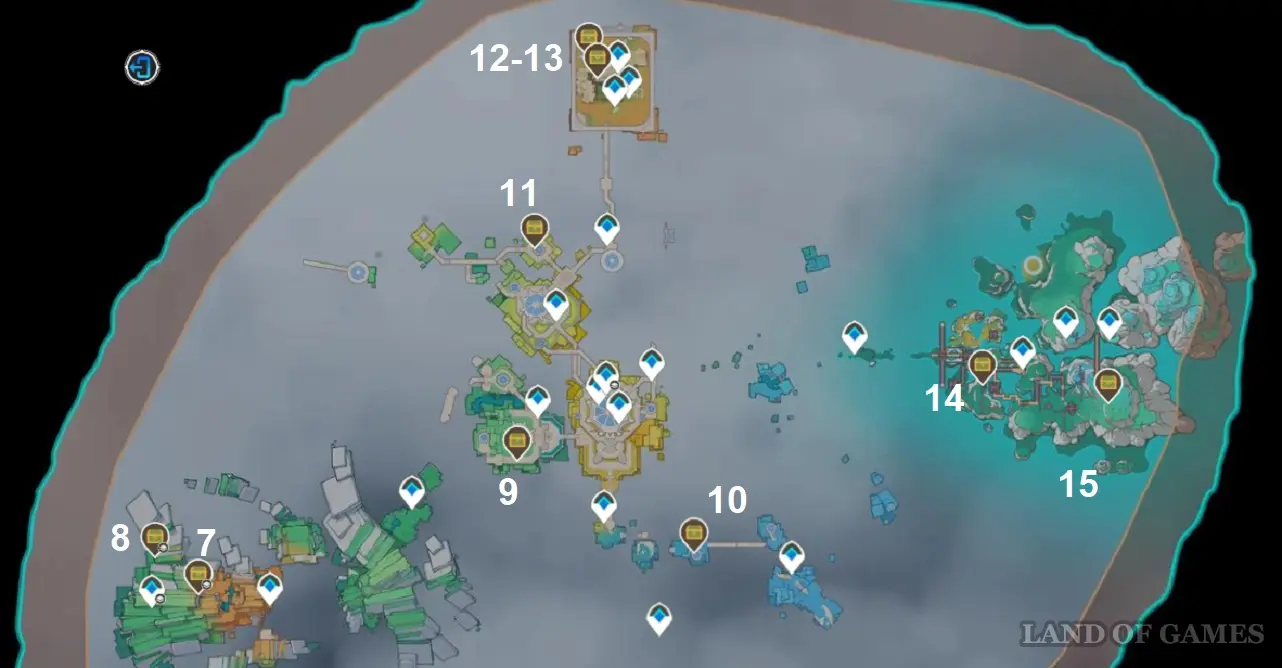 В новых регионах Тейвата можно найти 222 различных сундука. На карте ниже будет показано их примерное расположение. Некоторые из них стоят прямо на открытой местности, а другие спрятаны в темных пещерах, требуют разгадывания загадок или прохождения определенных заданий мира.