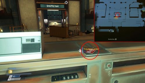 Карточку ключ для травматологического центра / медицинского пункта можно найти в главном вестибюле. Вы найдете ее на уровне 1 прямо посередине помещения. Она лежит на прилавке неподалеку от входа в челночный отсек. Советуем доверить уничтожение врагов турели, находящейся в углу возле стойки. Если на вас нападут, то просто подбегите к башенке и укройтесь за ней.
