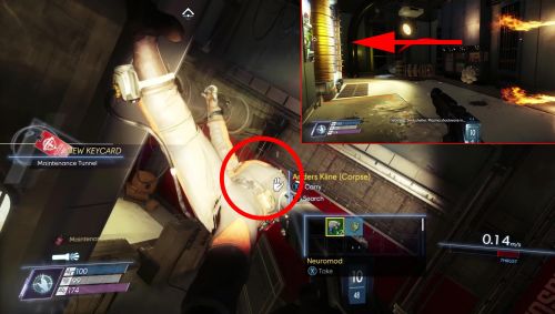 Эту карточку можно найти на трупе Келструпа. Вы узнаете о его судьбе, когда сможете вернуться в Атриум на первый этаж Лаборатории Психотроники. Алекс поговорит с вами и предоставит комбинацию для сейфа Келструпа. Его офис находится слева от того места, где остановится лифт. Чтобы пройти внутрь, просто перелезьте через окно. Осмотрите тело на полу, чтобы найти ключ-карту.