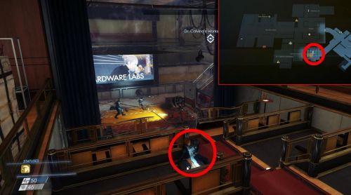 Карточка каюты Кальвино хорошо спрятана. Вначале вам стоит направиться в мастерскую Кальвино. Оказавшись внутри, разберитесь со всеми противниками и реактивируйте одно зеркальное отображение, которое все еще выглядит цельным. Просмотрите видео и вы узнаете, что у доктора был своеобразный тайничок. Чтобы открыть его, проверьте северную часть мастерской и подберите тумблер Кальвино. Поместите его на весы, стоящие на столе слева от рабочего зеркального отображения. В результате вы сможете открыть секретный сейф, в котором лежат нейромоды и ключ-карта к каюте Лоренцо.