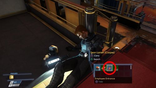 Направляйтесь на Демонстрационную сцену, расположенную на первом уровне Аппаратной Лаборатории. Среди кресел вы обнаружите тело Шона Ларсена. Обыщите его и заберите нужную ключ-карту. Не забудьте взять с трупа другие полезные вещички.