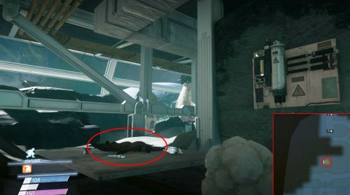 Тело находится в грузовом туннеле. Идите по нему, пока не дойдете до перекрестка. Поверните направо (по направлению к Грузовому отсеку). Вы пройдете через несколько радиоактивных бочек, стоящих в коридоре. Далее нужно отправиться к следующим коридорам с большой черной трубой. За ней вы и отыщите труп, который будет окружен кучей цистоидов.
