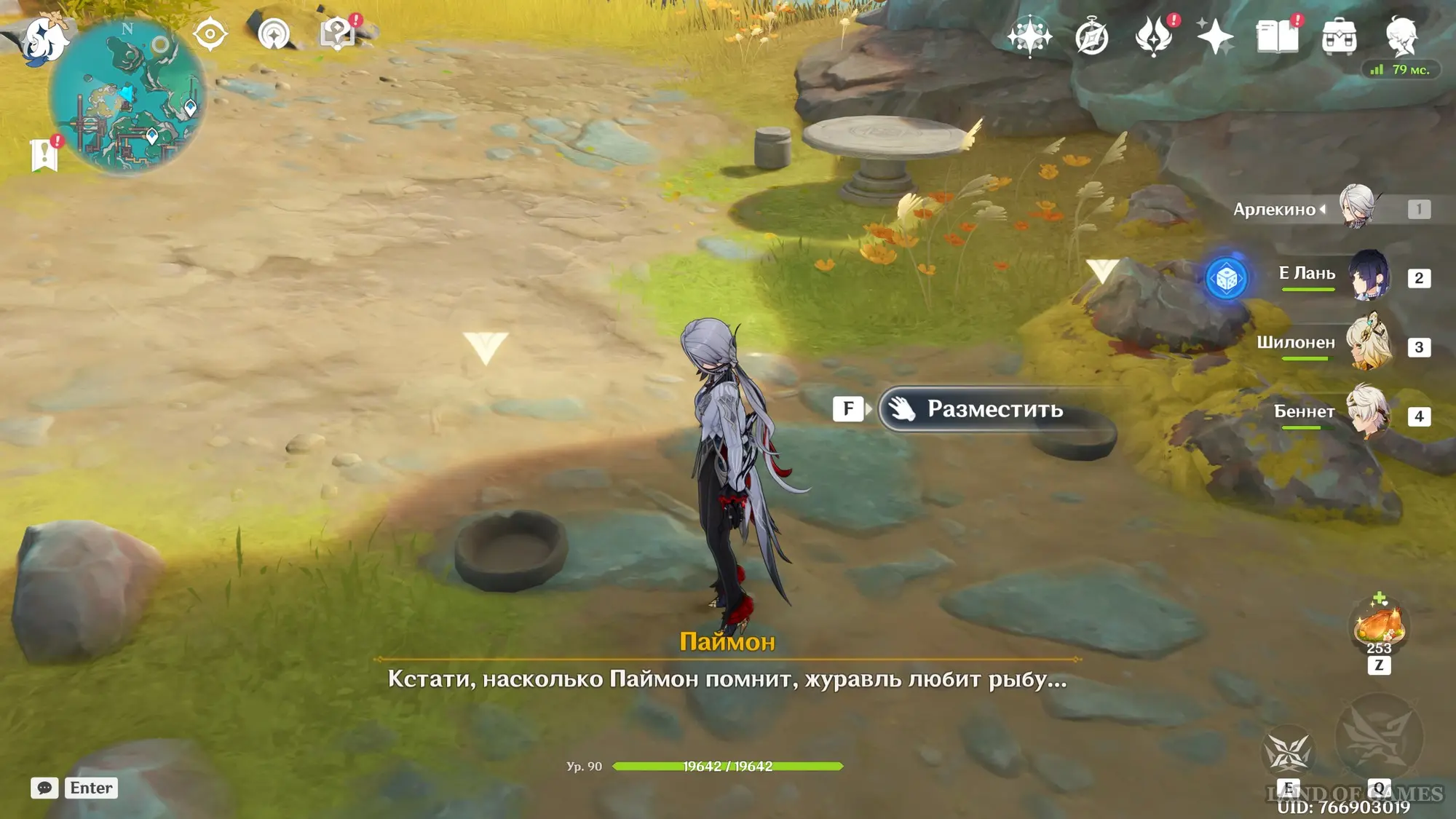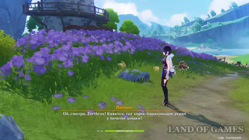 Снова возвратитесь к предыдущему телепорту, а затем бегите вперед и направо в сторону поля с фиолетовыми цветами. Чуть левее вы увидите лунку с хорьком-барахольщиком, который выбежит из своей норки и украдет орех. Вам нужно будет возвратить шишку белкам.