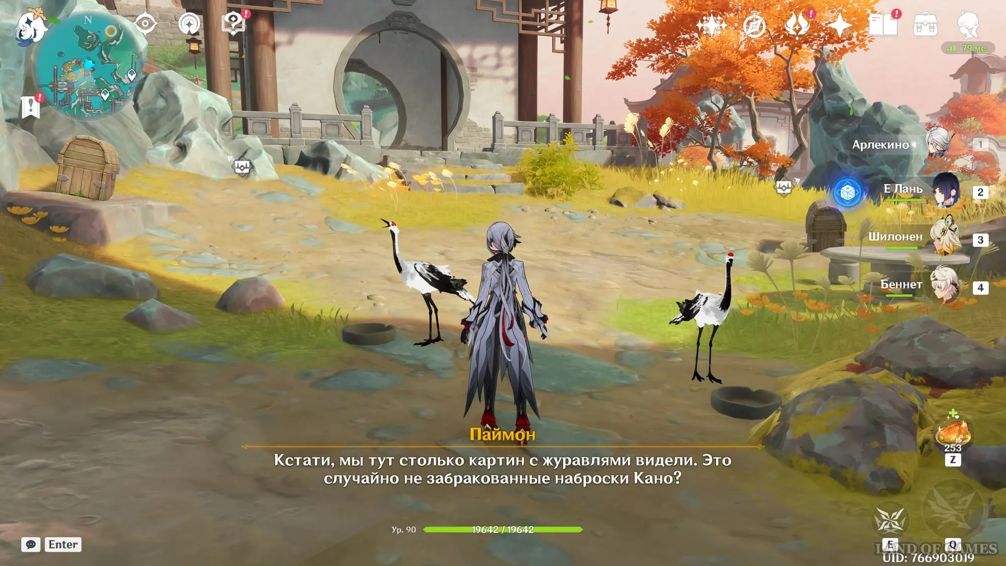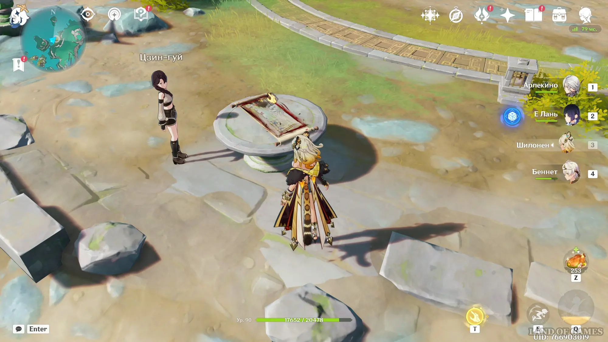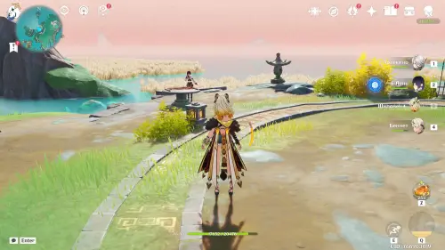 Телепортируйтесь к самой северной путевой точке, а затем развернитесь и начните двигаться на север в сторону круглой арены возле побережья моря. Здесь вы обнаружите заблокированный богатый сундук и девушку по имени Цзин-гуй – пообщайтесь с ней. Затем взаимодействуйте с картиной на столе и сопоставьте пейзаж с реальностью, чтобы создать метку испытания.