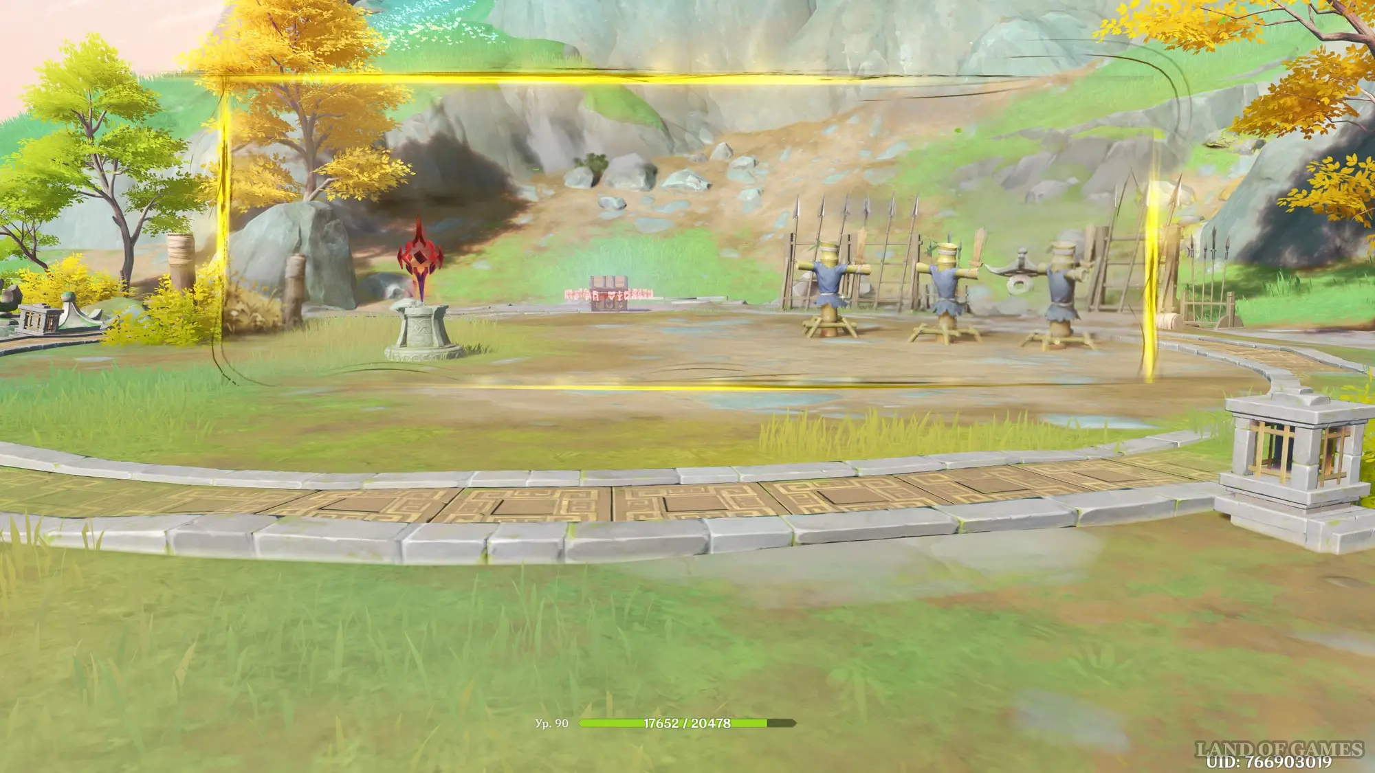 Возвратитесь к предыдущему телепорту, а потом поверните камеру влево и вверх – начните забираться на выступ впереди, чтобы попасть на тренировочную площадку с рыцарями. Здесь вы увидите три манекена – тут же уничтожьте их обычными атаками.