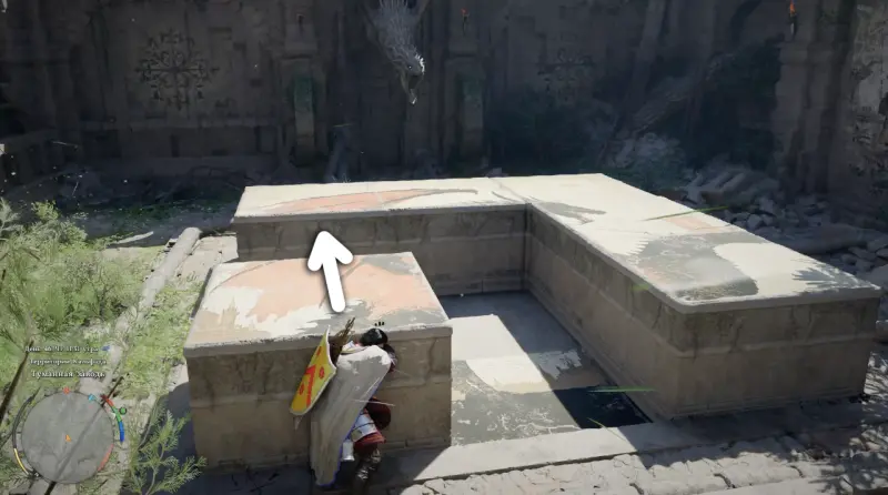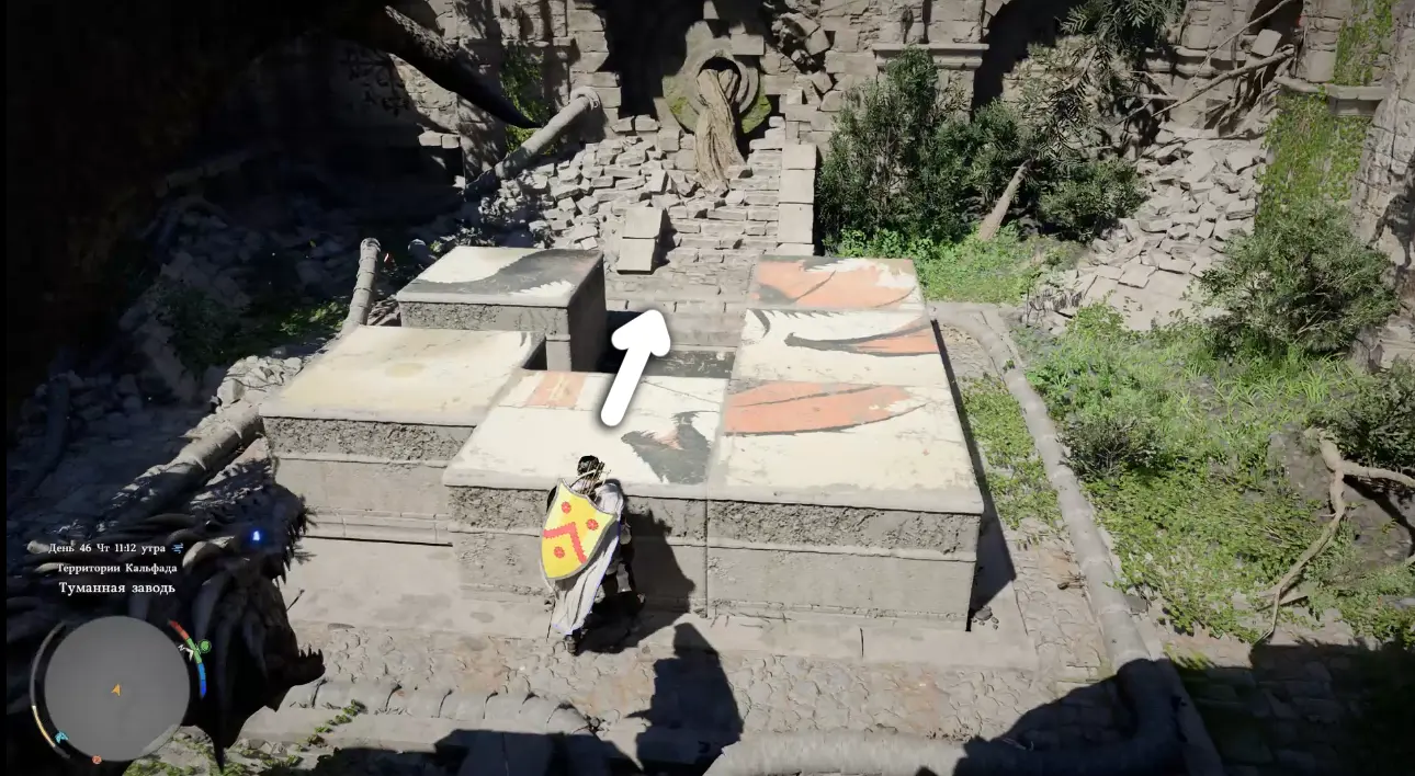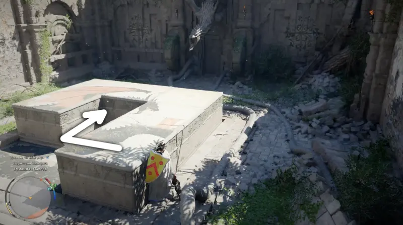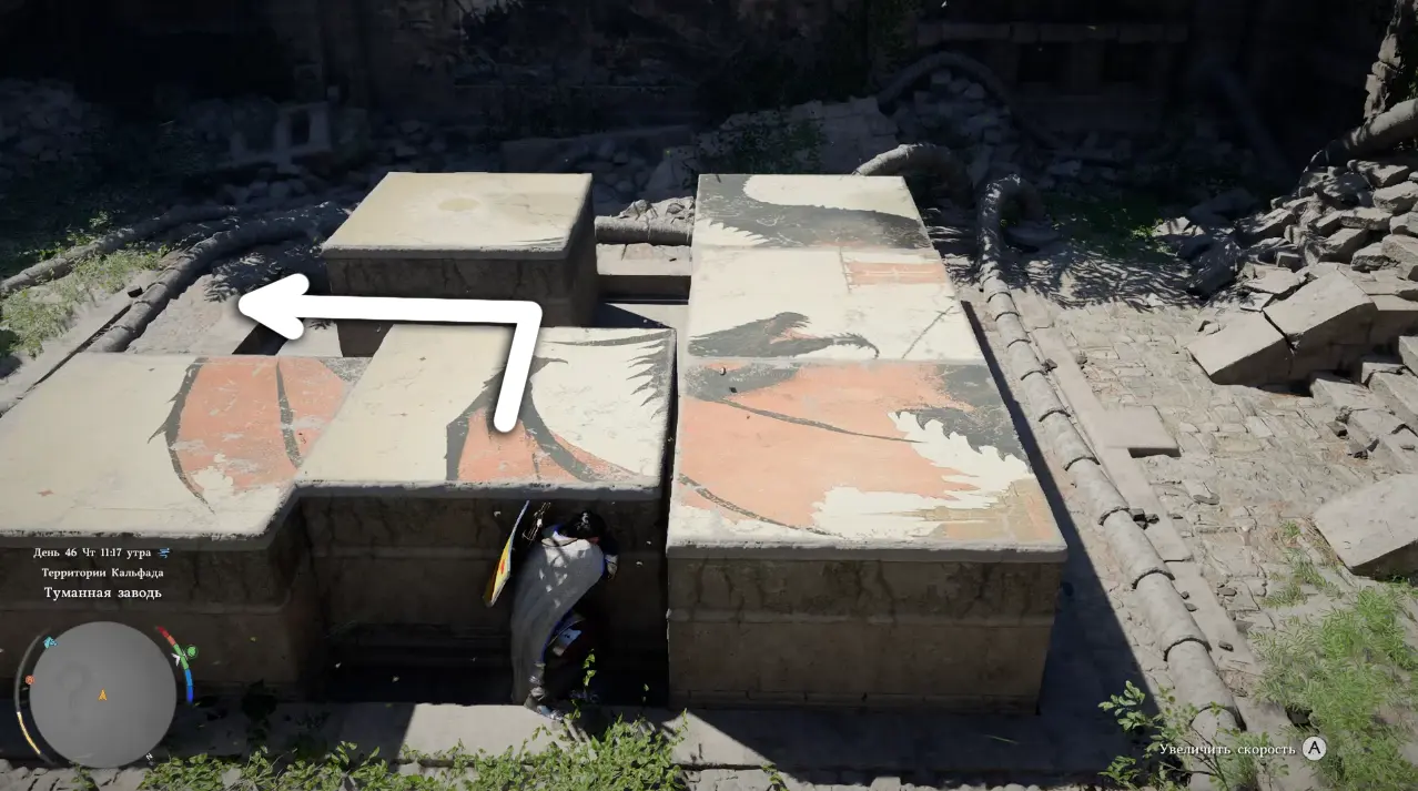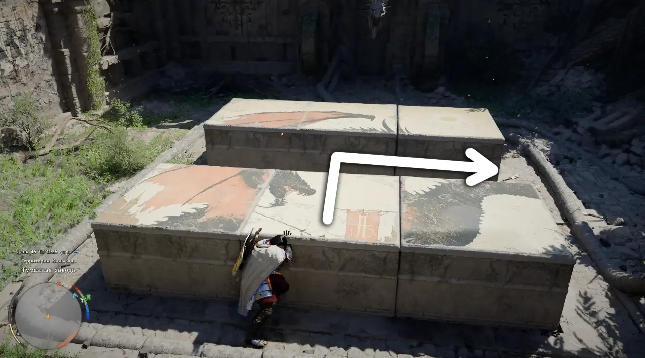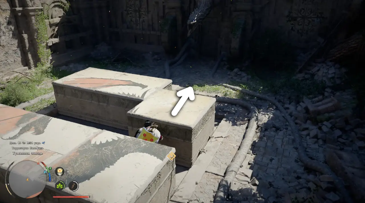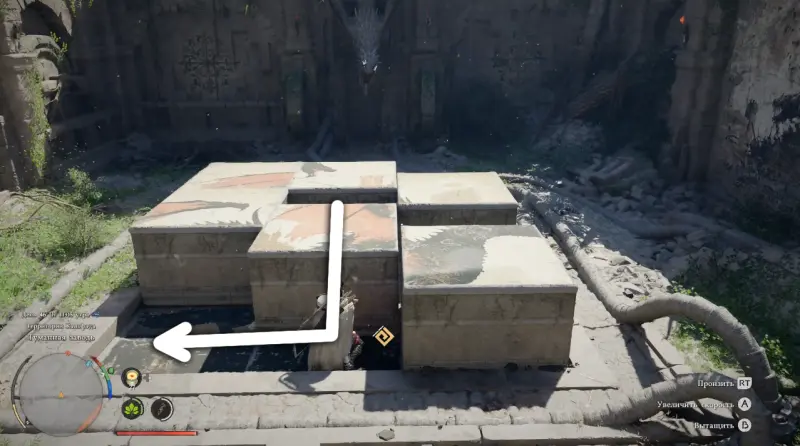 Когда подойдете ближе, обнаружите площадку с каменной панелью, разделенной на несколько квадратных плит. Именно они и формируют изображение, которое нужно восстановить.