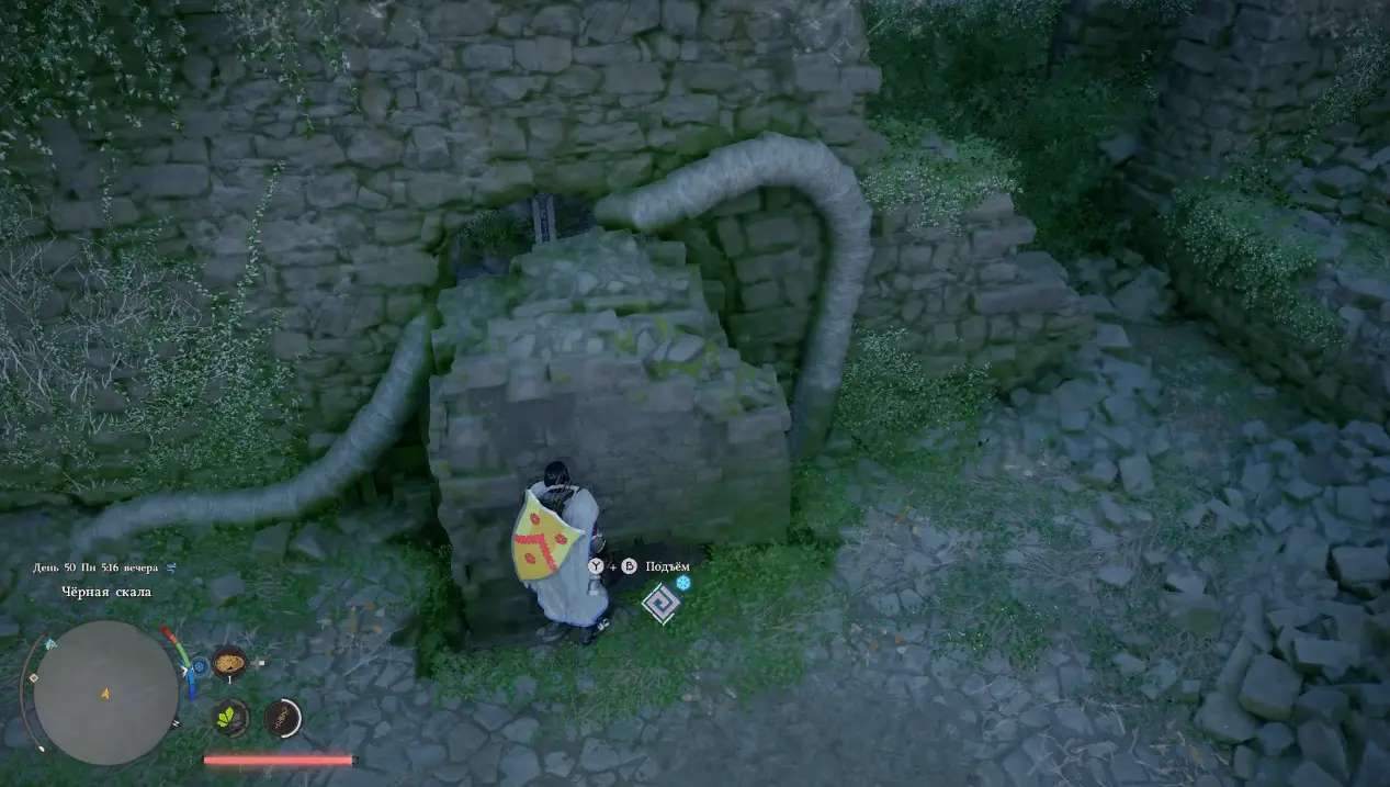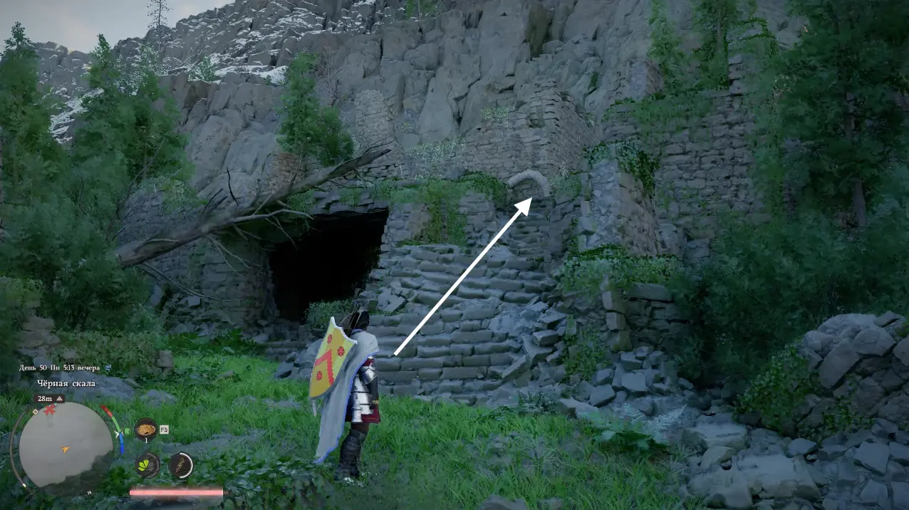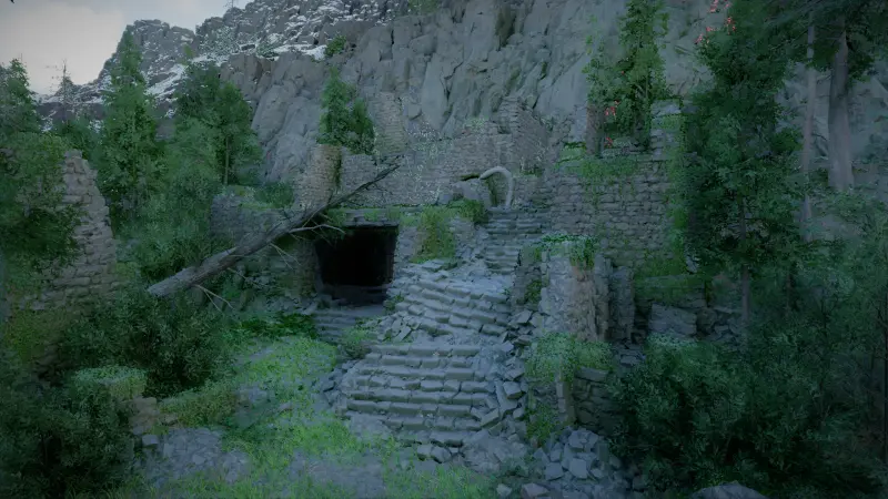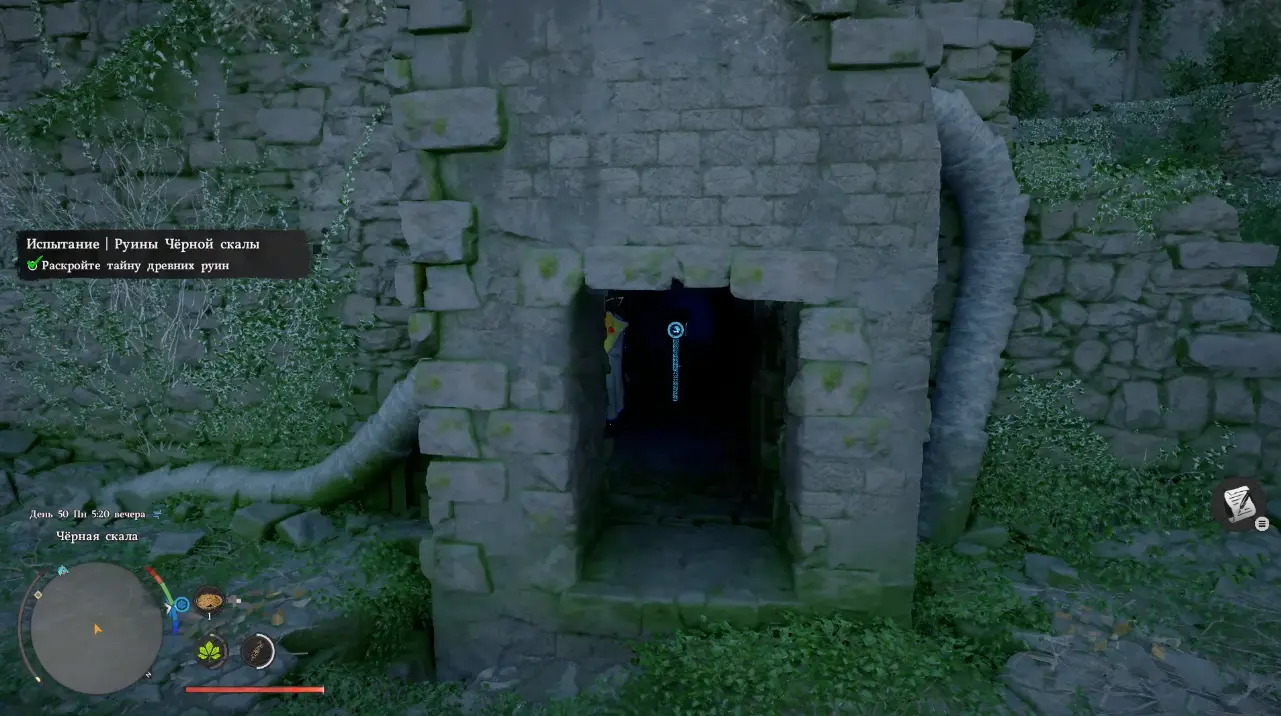 Вход в руины легко пропустить, так как он выглядит как заваленное углубление в скале. Внутри вас ждет компактная зона с одной ключевой точкой взаимодействия.
