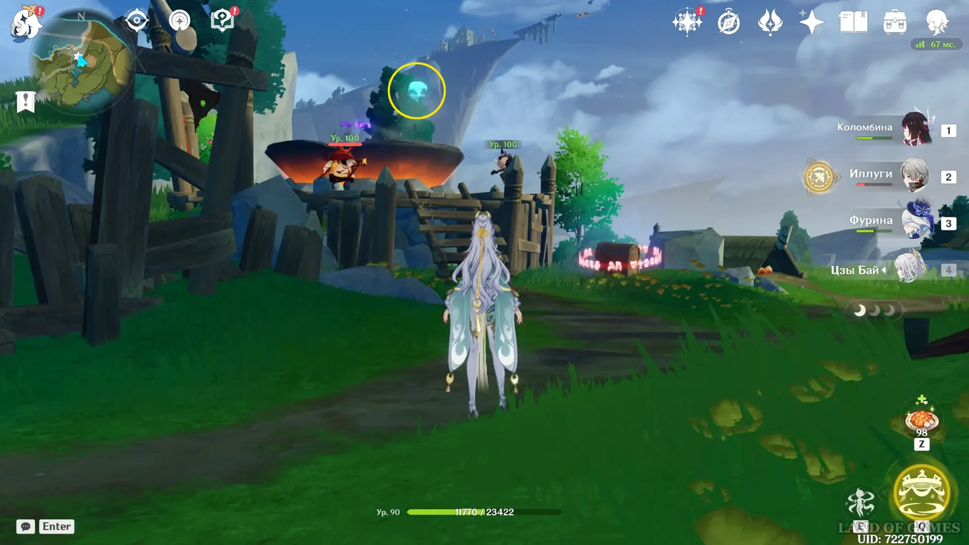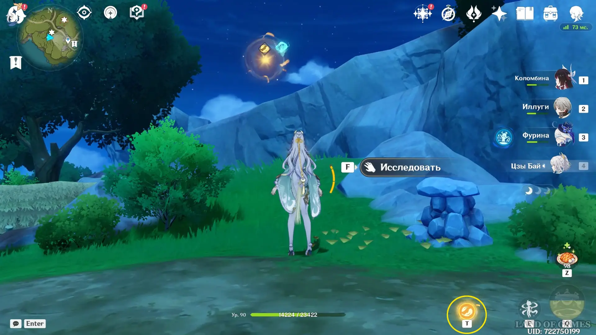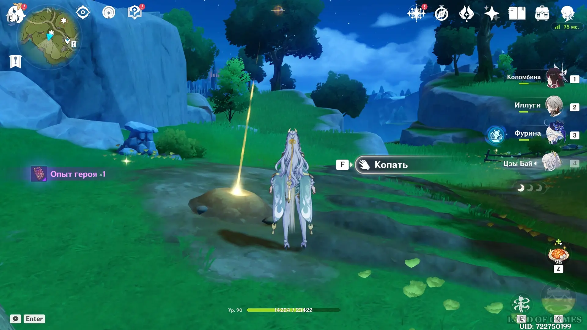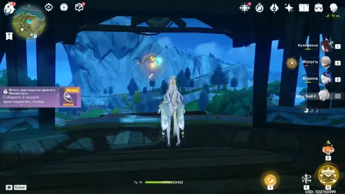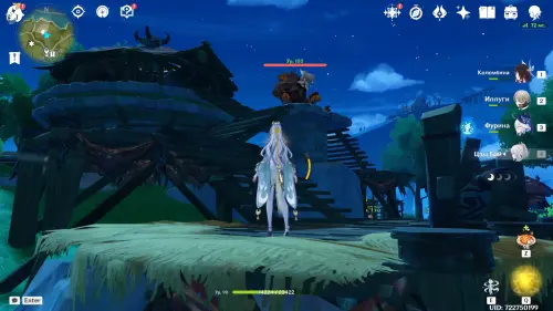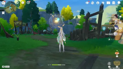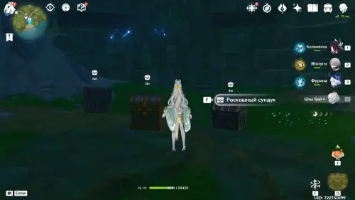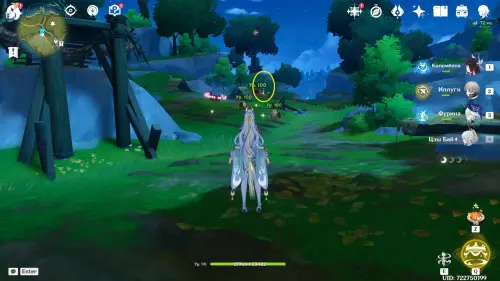Направляйтесь к круглому водоему и первым делом проследуйте на северо-запад, где расположена стоянка хиличурлов. Одержав победу над противниками, вы получите доступ к богатому сундуку, а неподалеку, на открытой местности среди шалашей, обнаружите подсвеченную точку интереса с функцией «Копать».