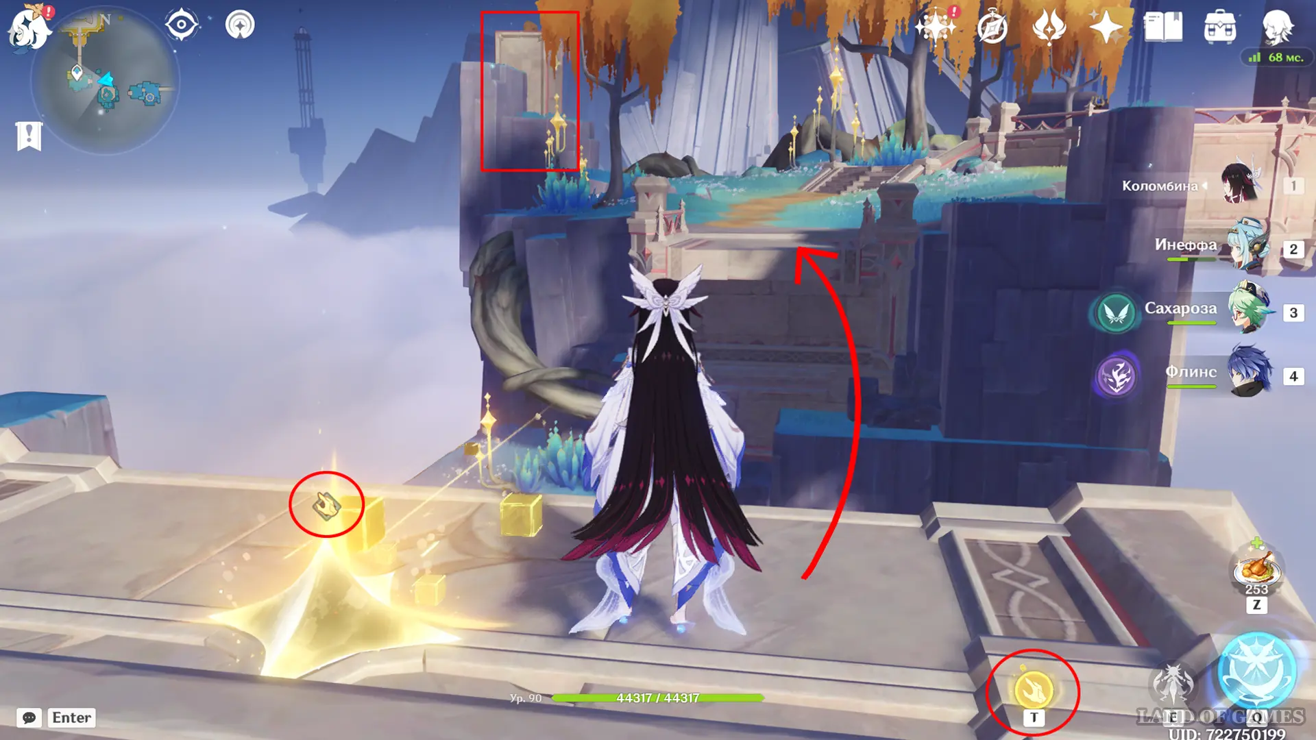 Начнем с управляемого объекта на юге карты Храма: переместитесь к ближайшему телепорту, подойдите к двухуровневой скале на краю площадки и опустите колонну, призвав Декса навыком на «T» – на ней вы найдете один обычный сундучок.