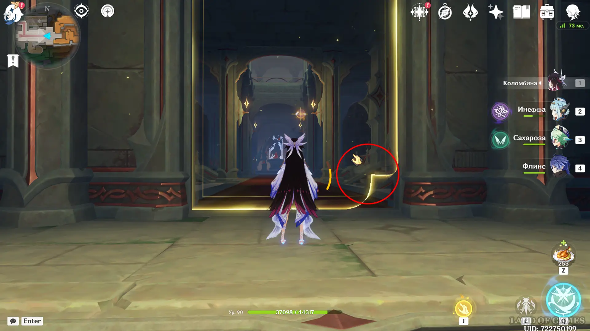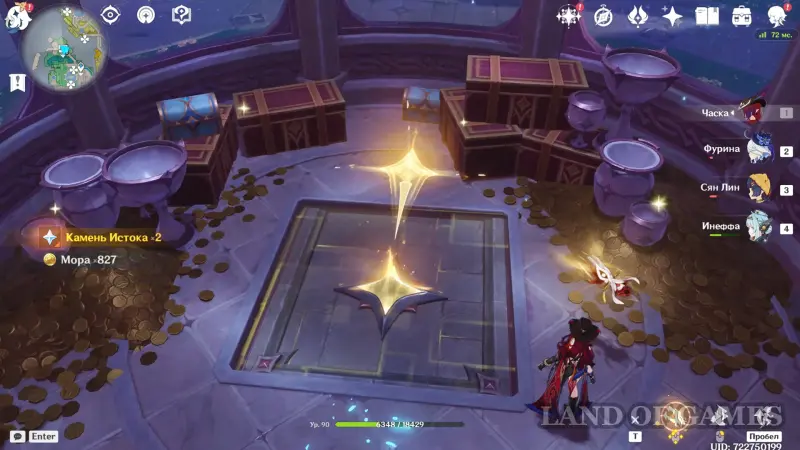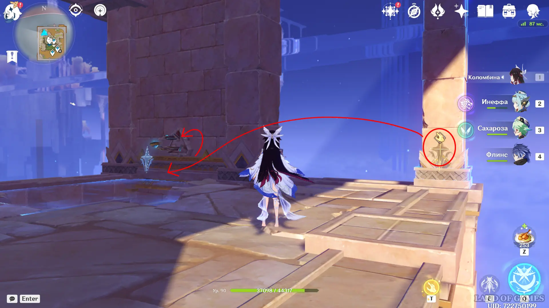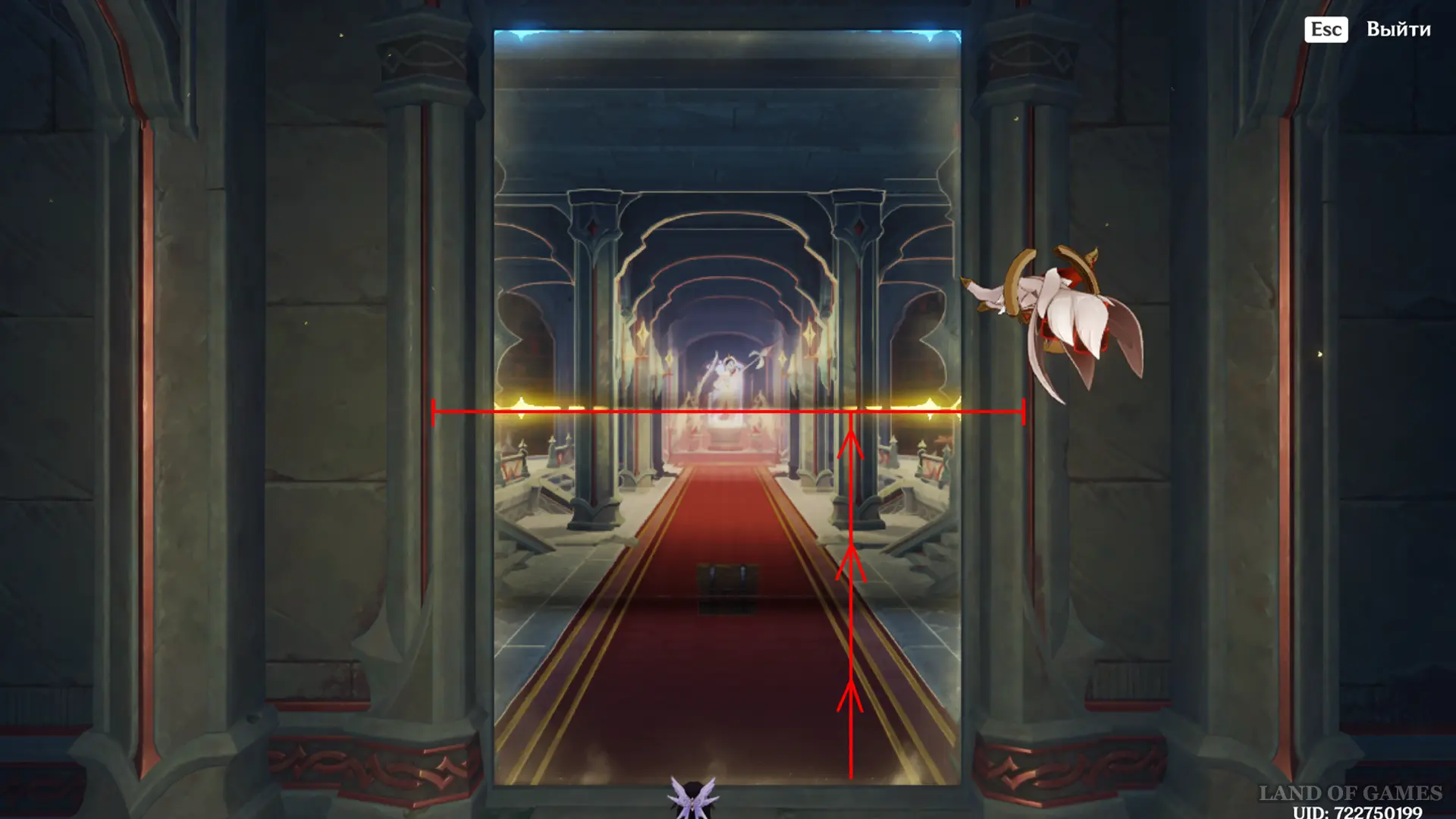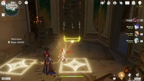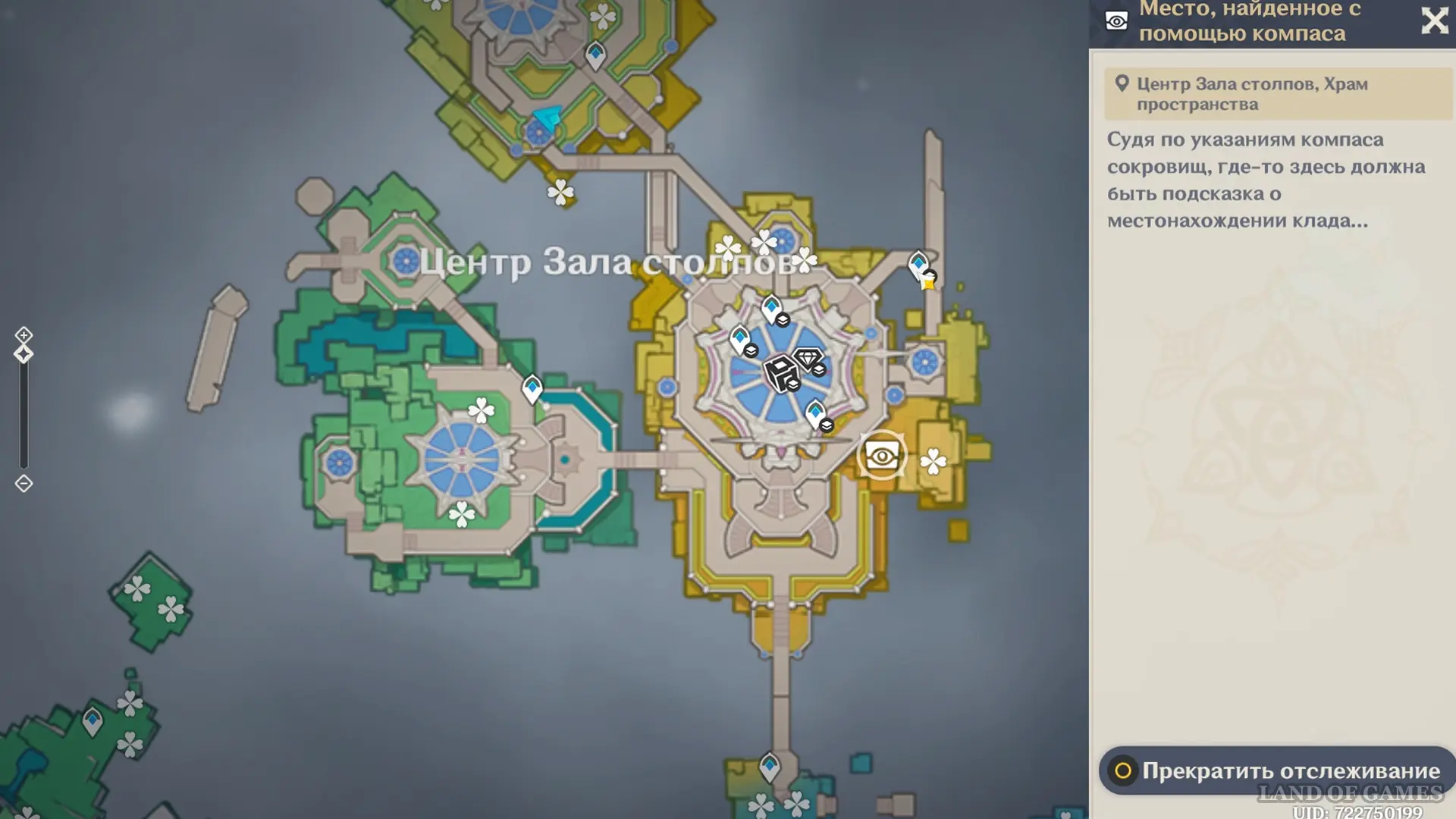 Решение головоломки с метателем и стендами под восточным островом в Центре Зала столпов, за которую полагаются два богатых и один драгоценный сундук, мы разобрали отдельно (см. пункт про 8-й сундук в Храме пространства).