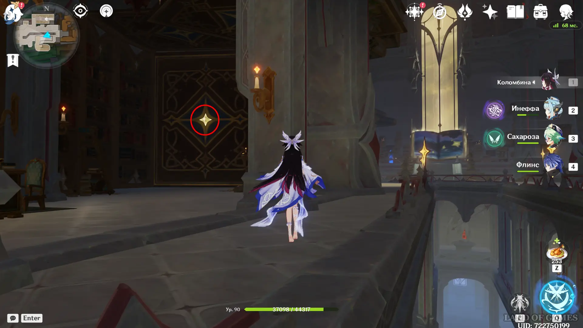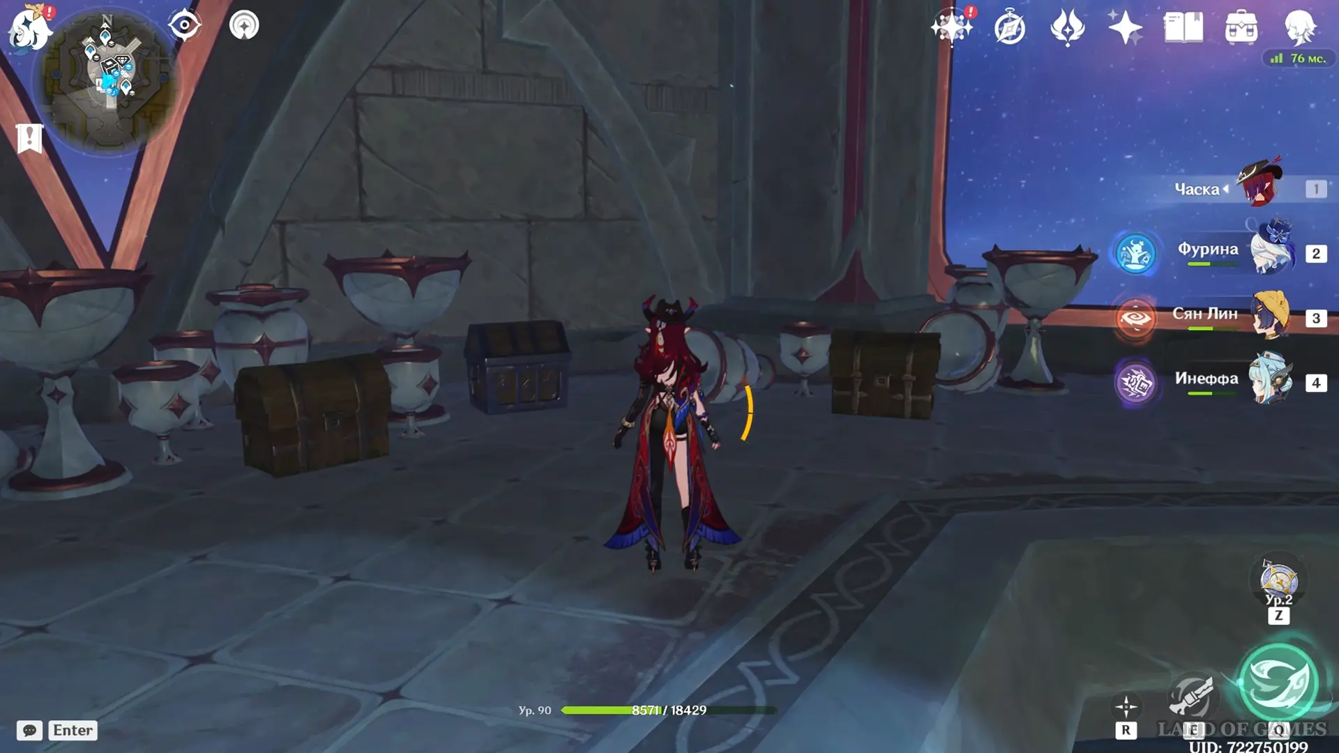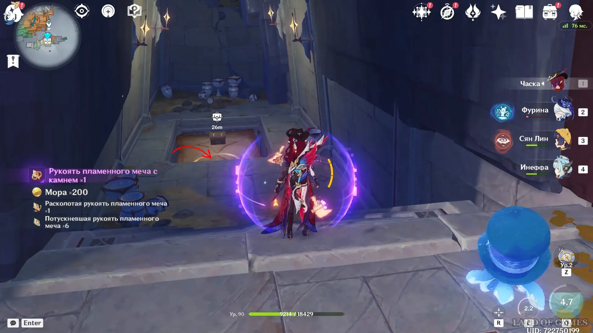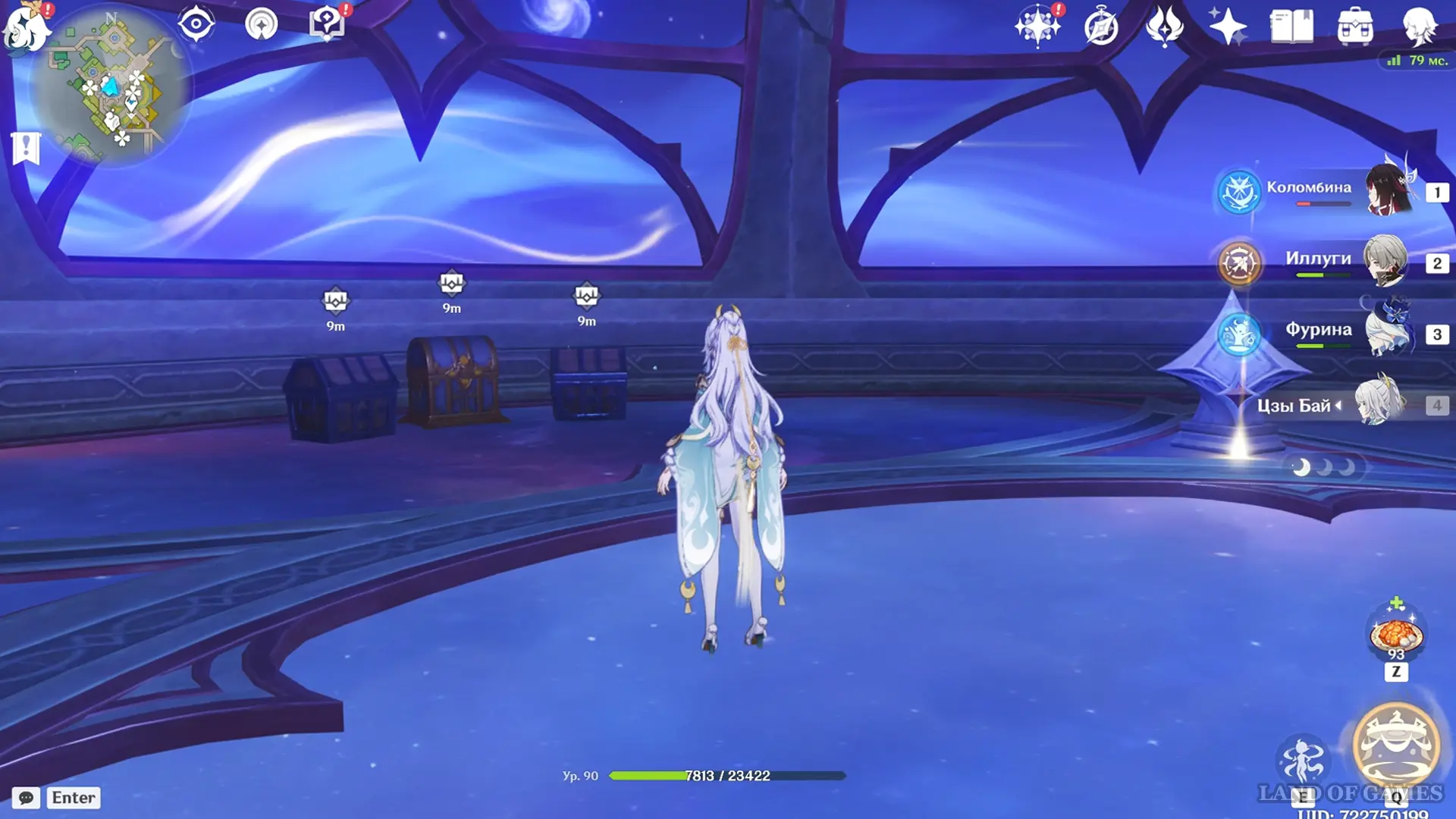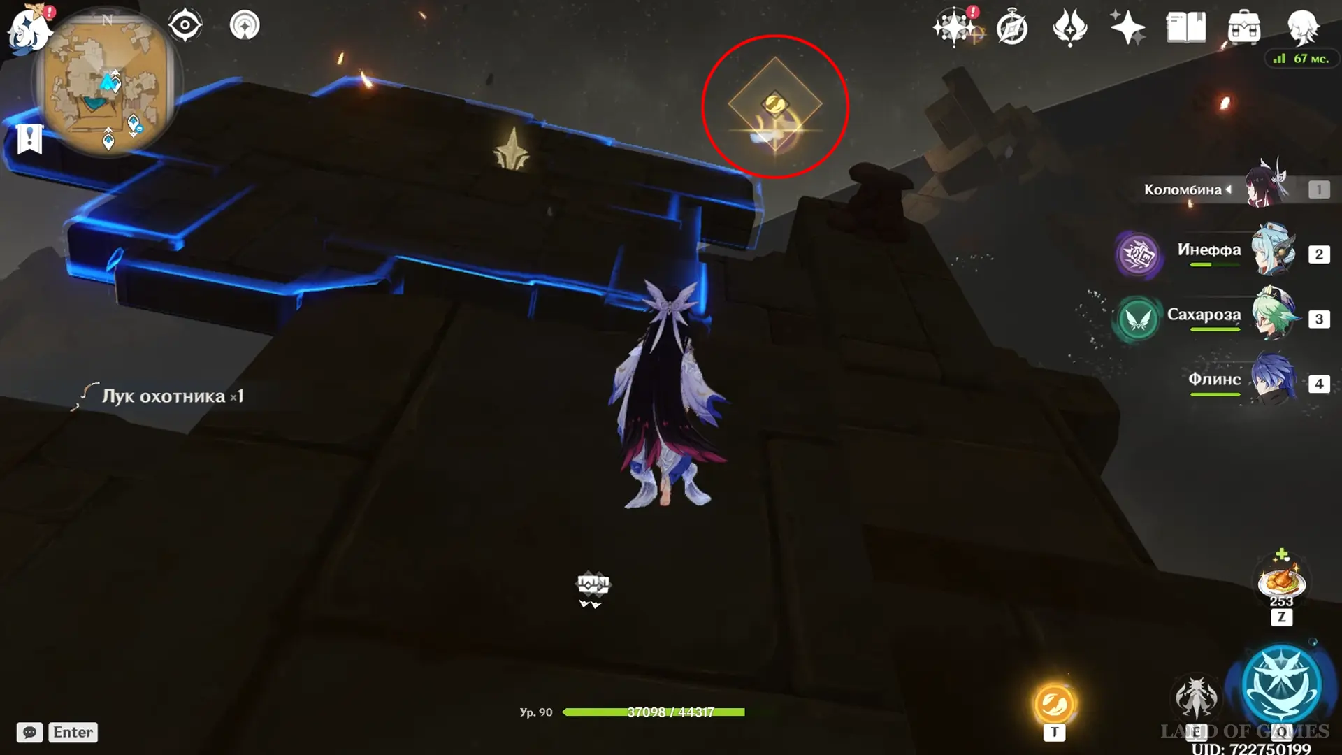 Решение головоломки с метателем и стендами под восточным островом в Центре Зала столпов, за которую полагаются два богатых и один драгоценный сундук, мы разобрали отдельно (см. пункт про 8-й сундук в Храме пространства).