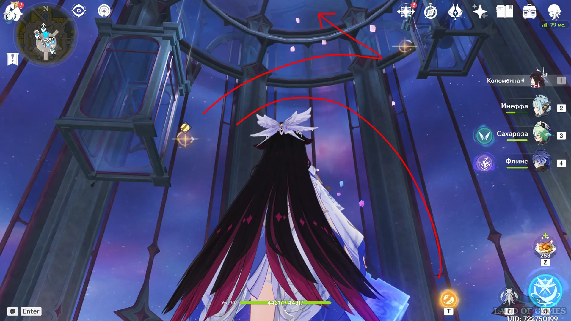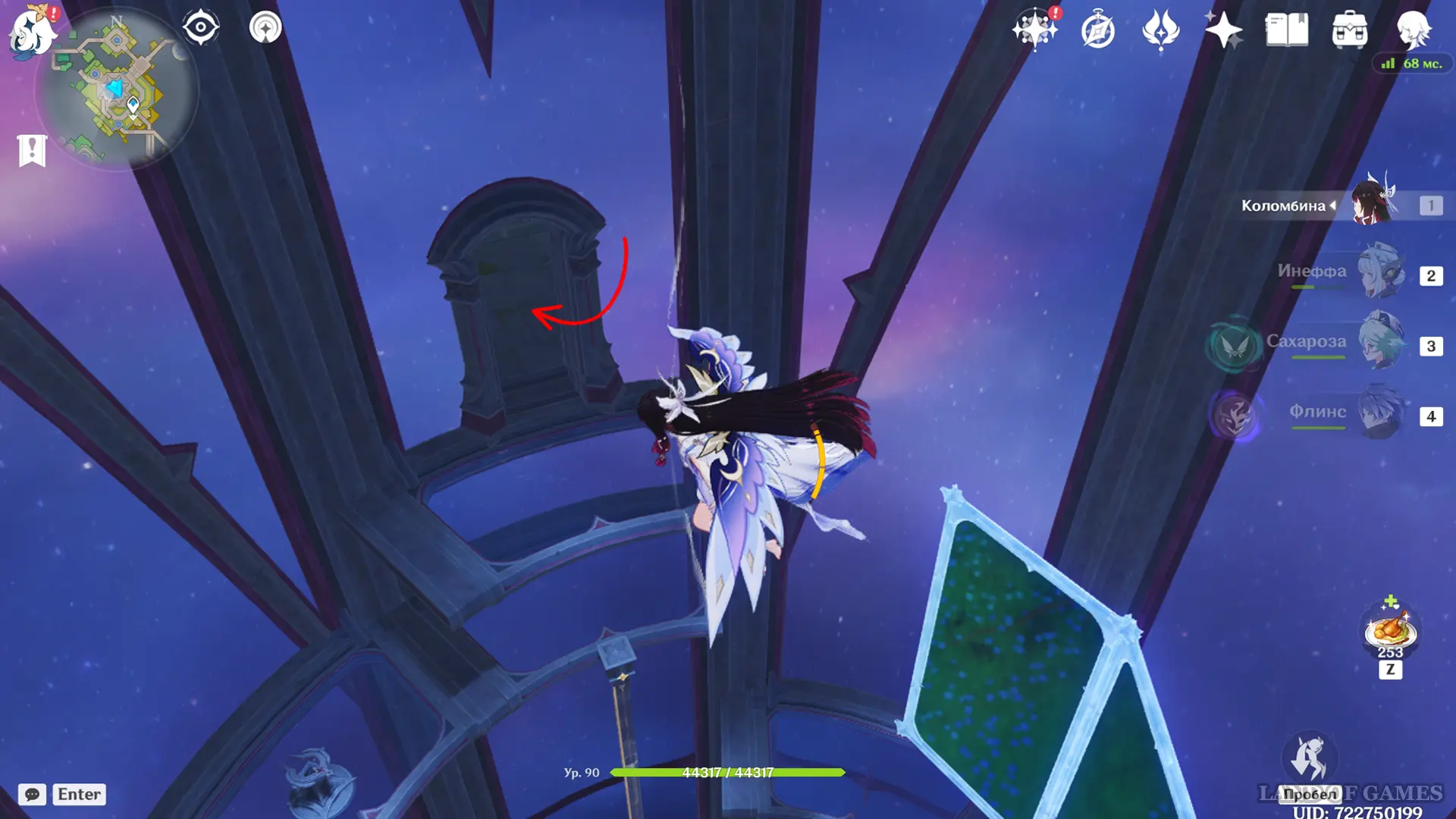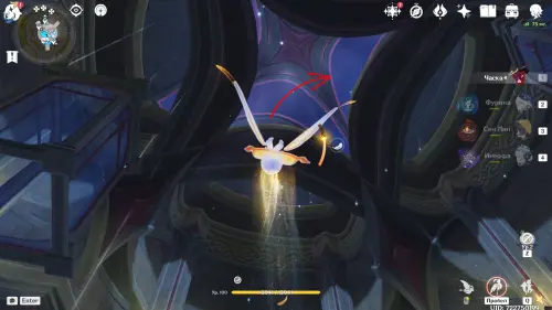 Телепортируйтесь к Ядру памяти в центре Храма и взгляните вверх. Над кубом парят метки гарпастумов: воспользуйтесь ими, чтобы принять форму мотылька и взлететь под самый купол. На вершине зала вас ждут два обычных сундука и один богатый.