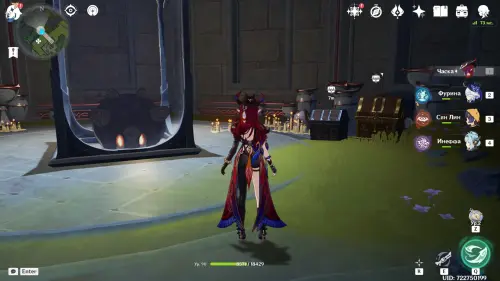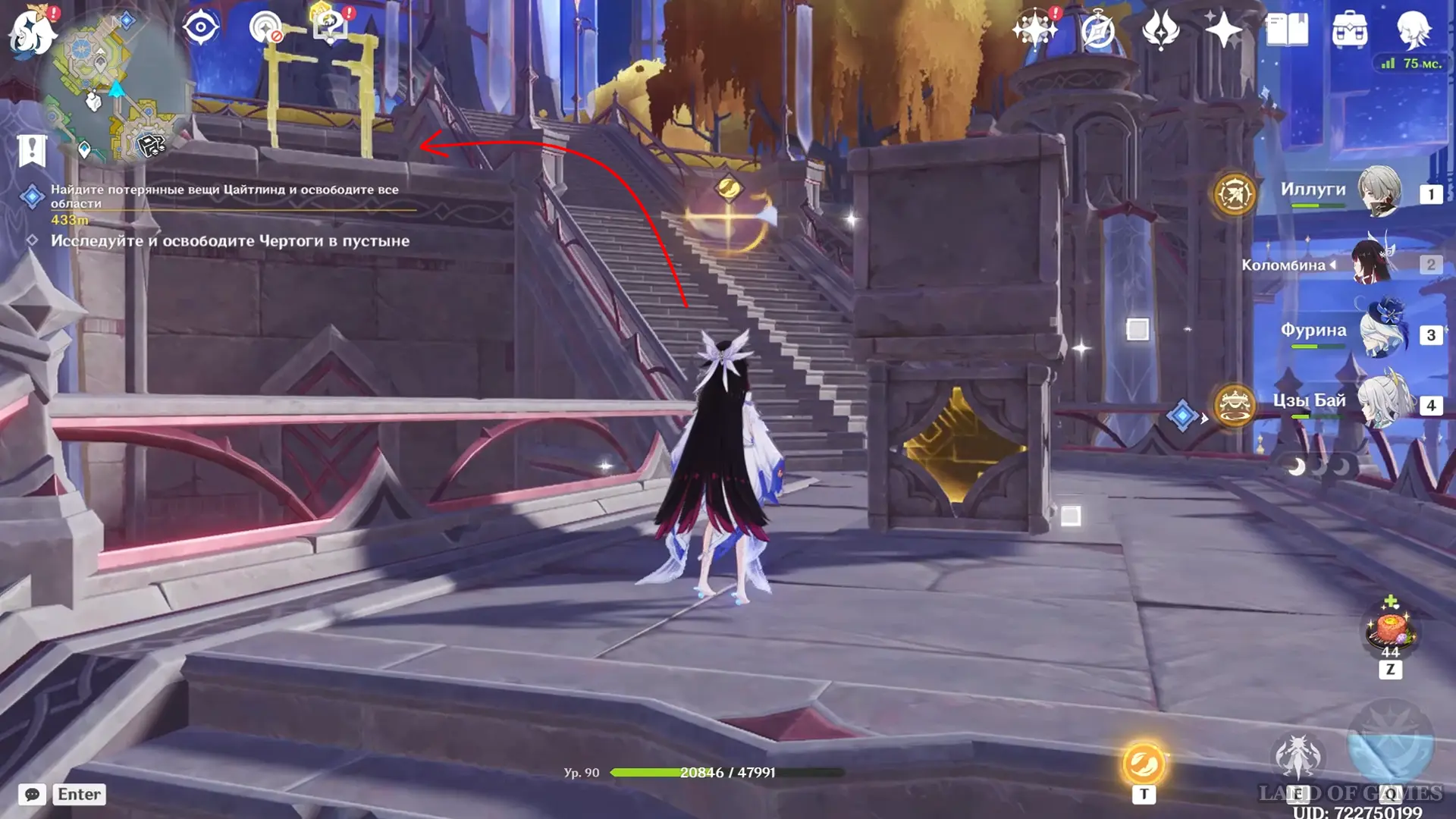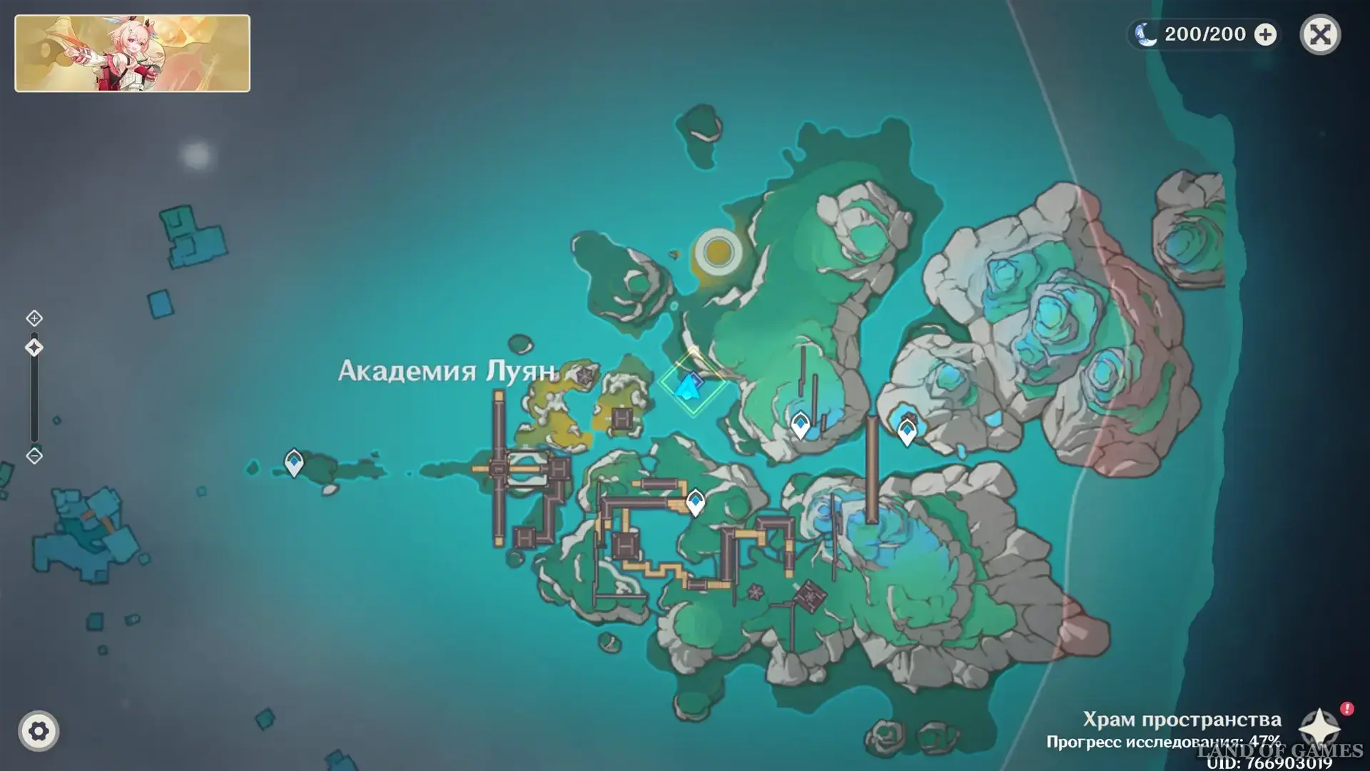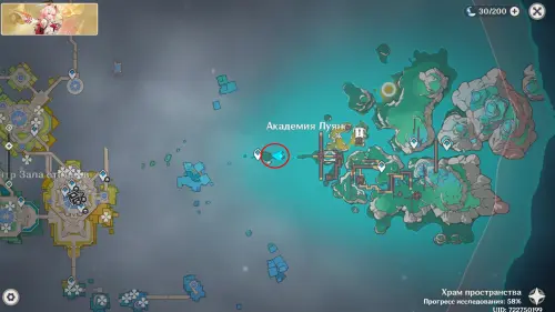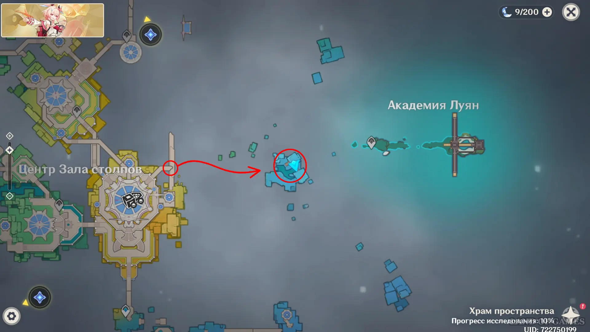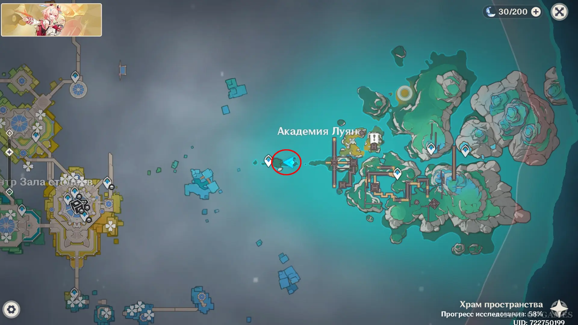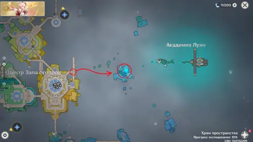 Поднимитесь на островок к восточному телепорту Академии Луян и поговорите с Кастильоне. Он предложит испытание с картинами и каменными платформами, в награду за которое вы получите Драгоценный сундук. Подробное решение этой загадки можно найти в нашем отдельном гайде (ищите в пункте про 13-й сундук в Храме пространства).