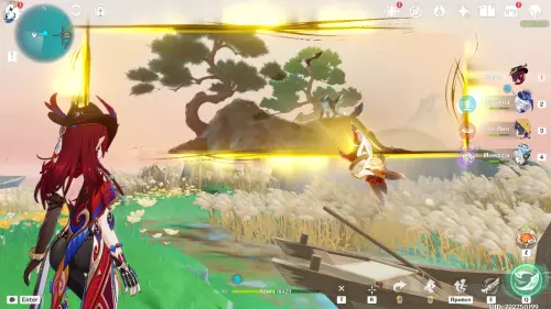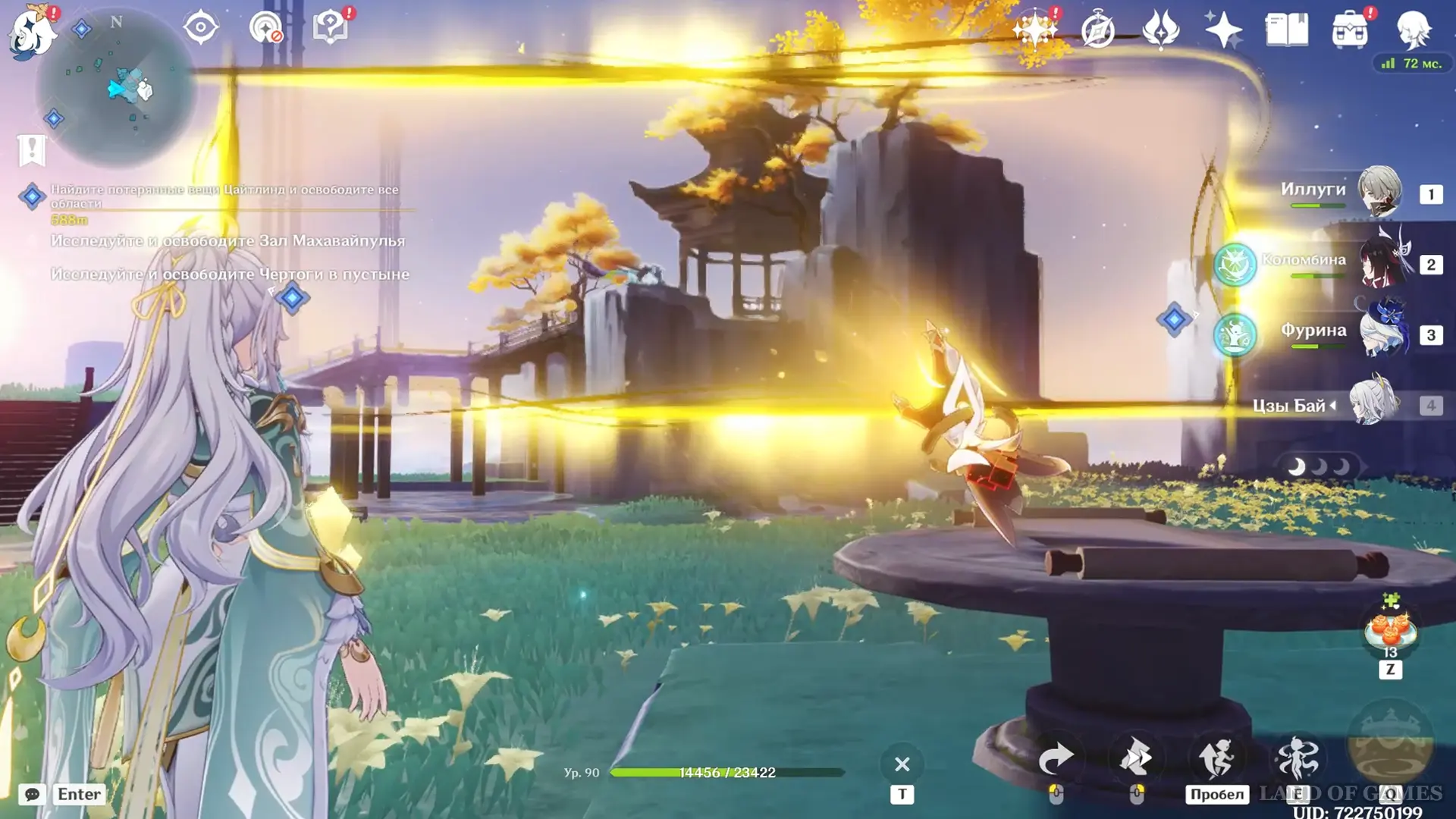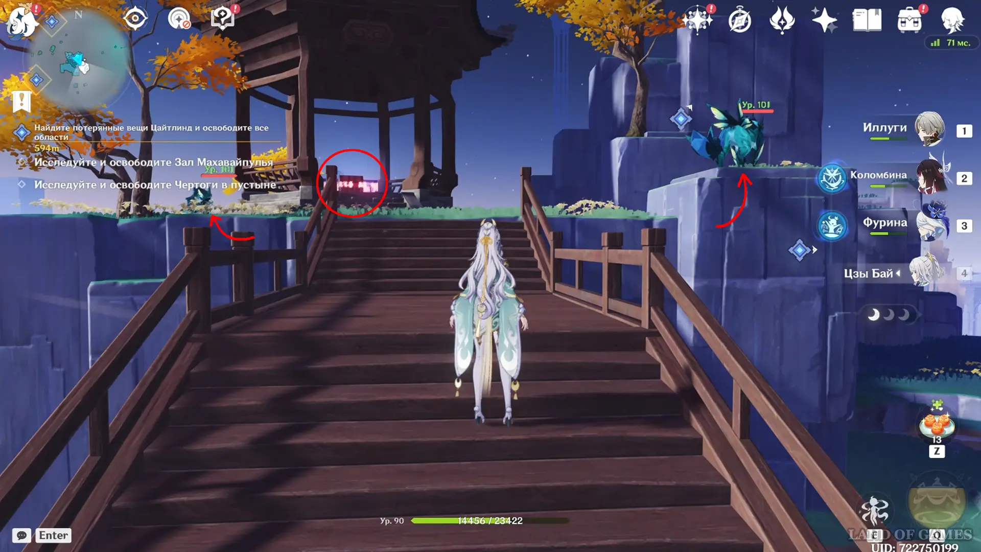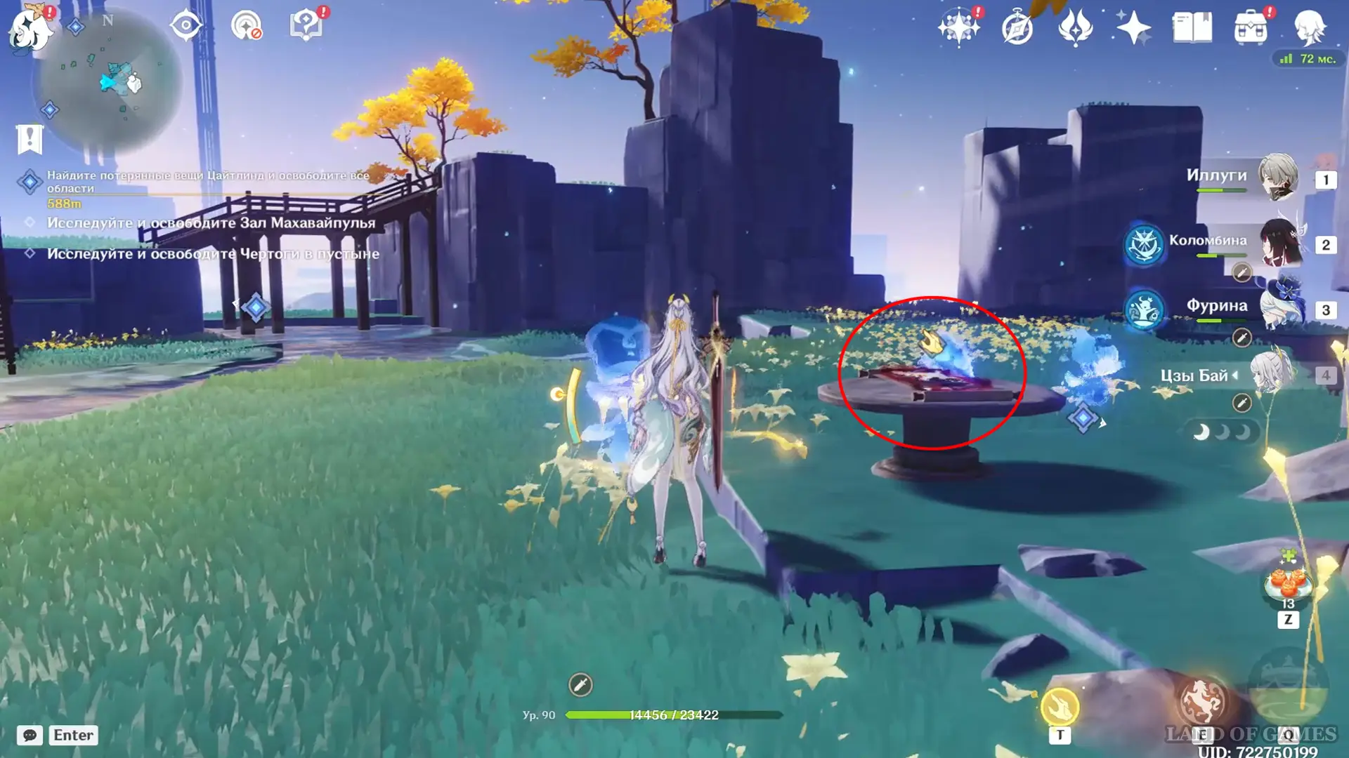 Выходите из башни с Ядром памяти через северо-восточный проход и идите к краю разрушенного моста. Воспользуйтесь порталом у края – он перенесет вас на островок к западу от Академии Луян. Там вы найдете стол с «Пространством в картине». Призовите Декса и совместите изображение с холмом, где стоит деревянная лестница: как только на нем проявится беседка, поднимайтесь наверх. Победите двух зверей Сюаньвэнь, чтобы забрать награду – богатый сундук.