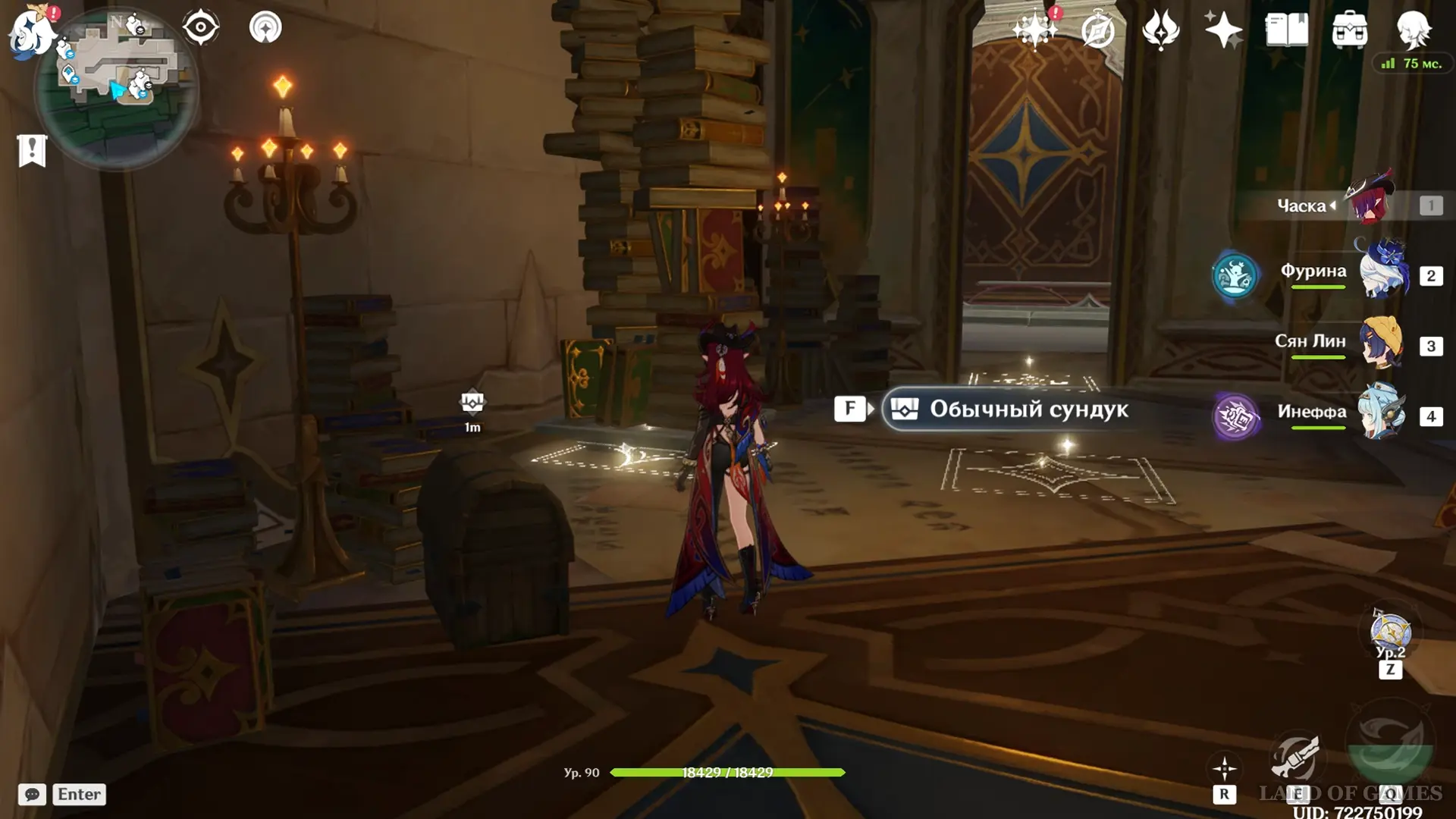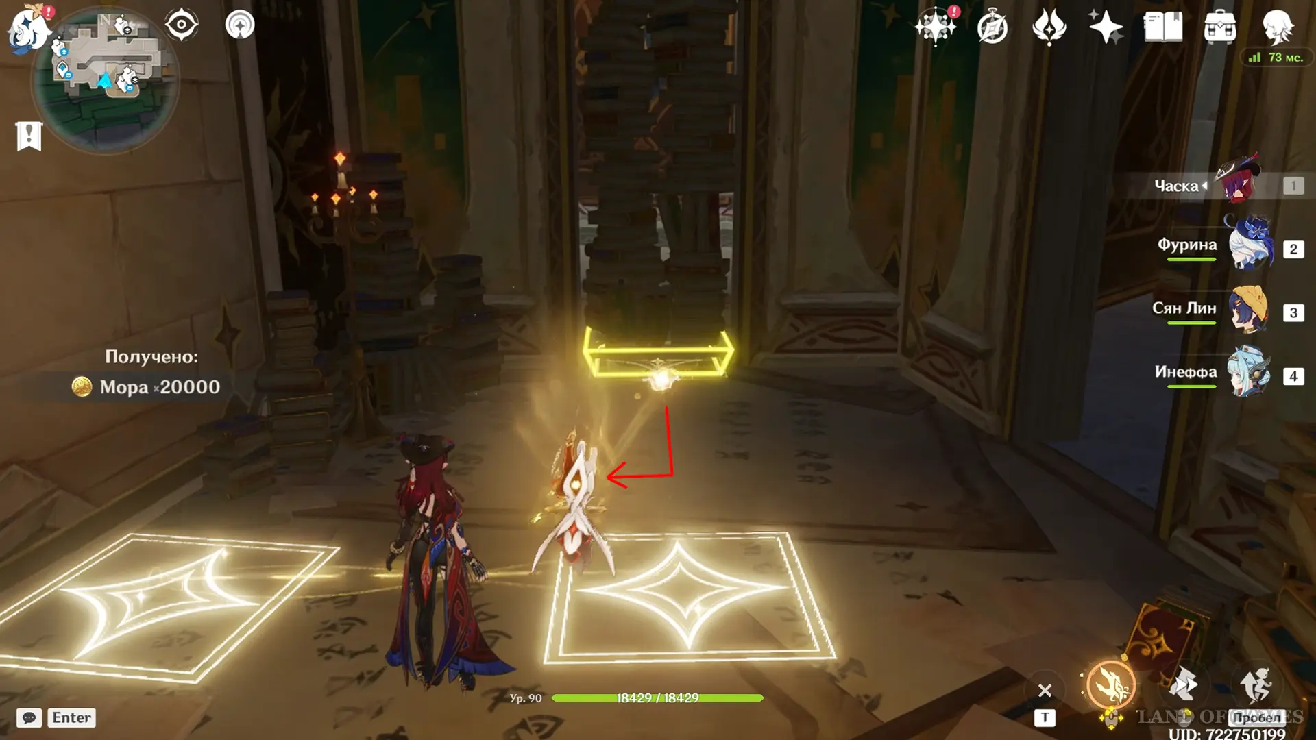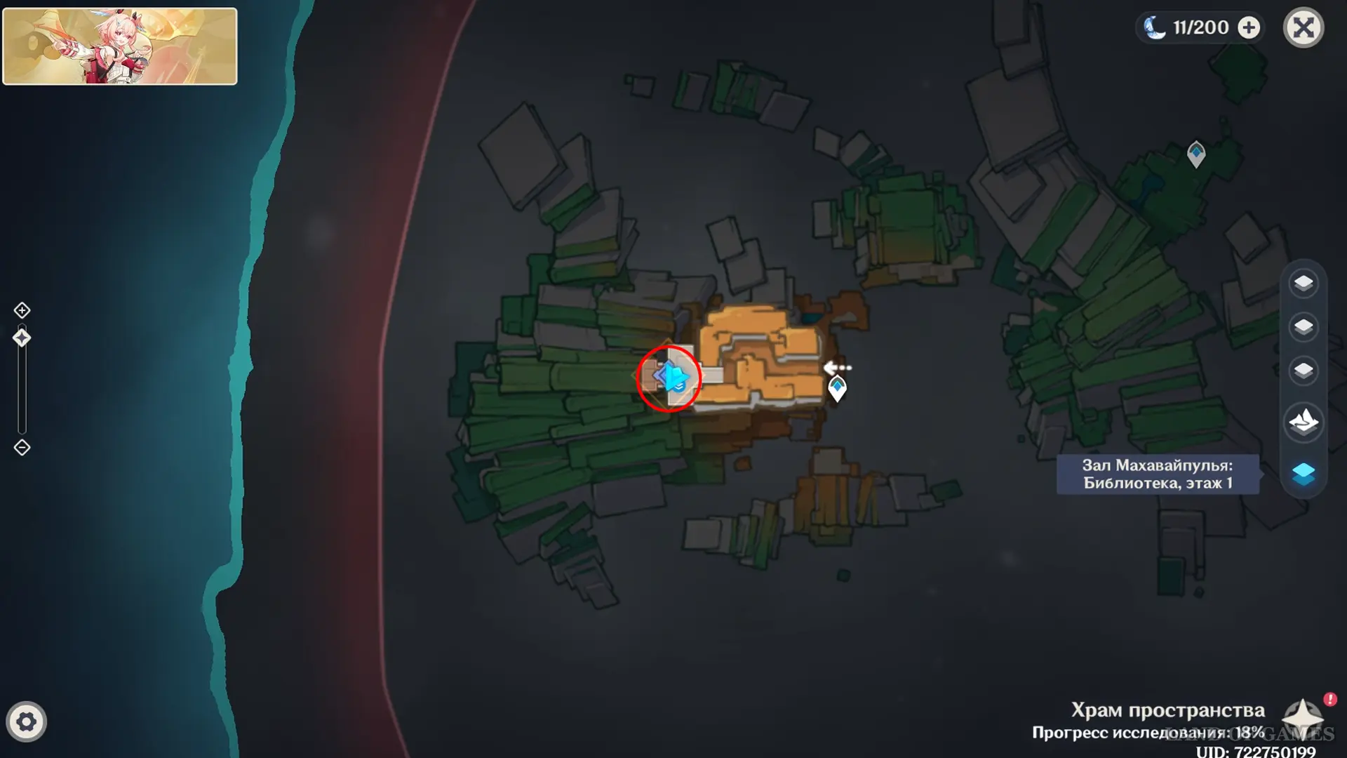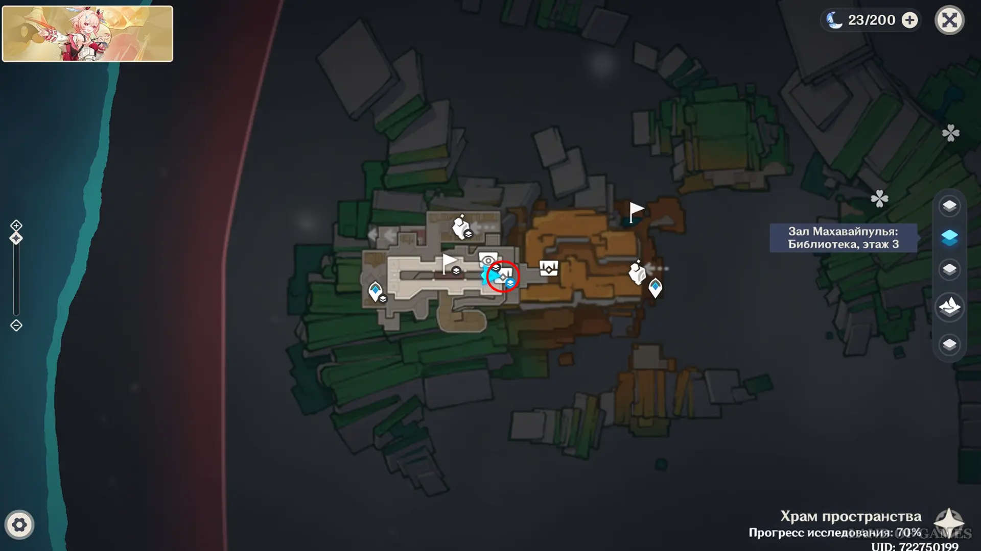 От западного подземного телепорта Библиотеки двигайтесь вперед, придерживаясь правой стены. За поворотом вы обнаружите книжную дверь. Пройдя внутрь, взаимодействуйте с каменным блоком, чтобы собрать мору и расчистить дорогу для платформы. Сдвиньте стопку книг на себя, а затем влево – после этого можно будет опустошить обычный сундук.