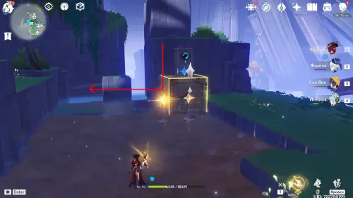Пройдите через арку в северной части ущелья и спуститесь к площадке с монстрами – они охраняют второй куб и богатый сундук. Разберитесь с противниками, а затем сдвиньте платформу с кубом к краю и вправо, чтобы ее подхватил второй Перевозчик.