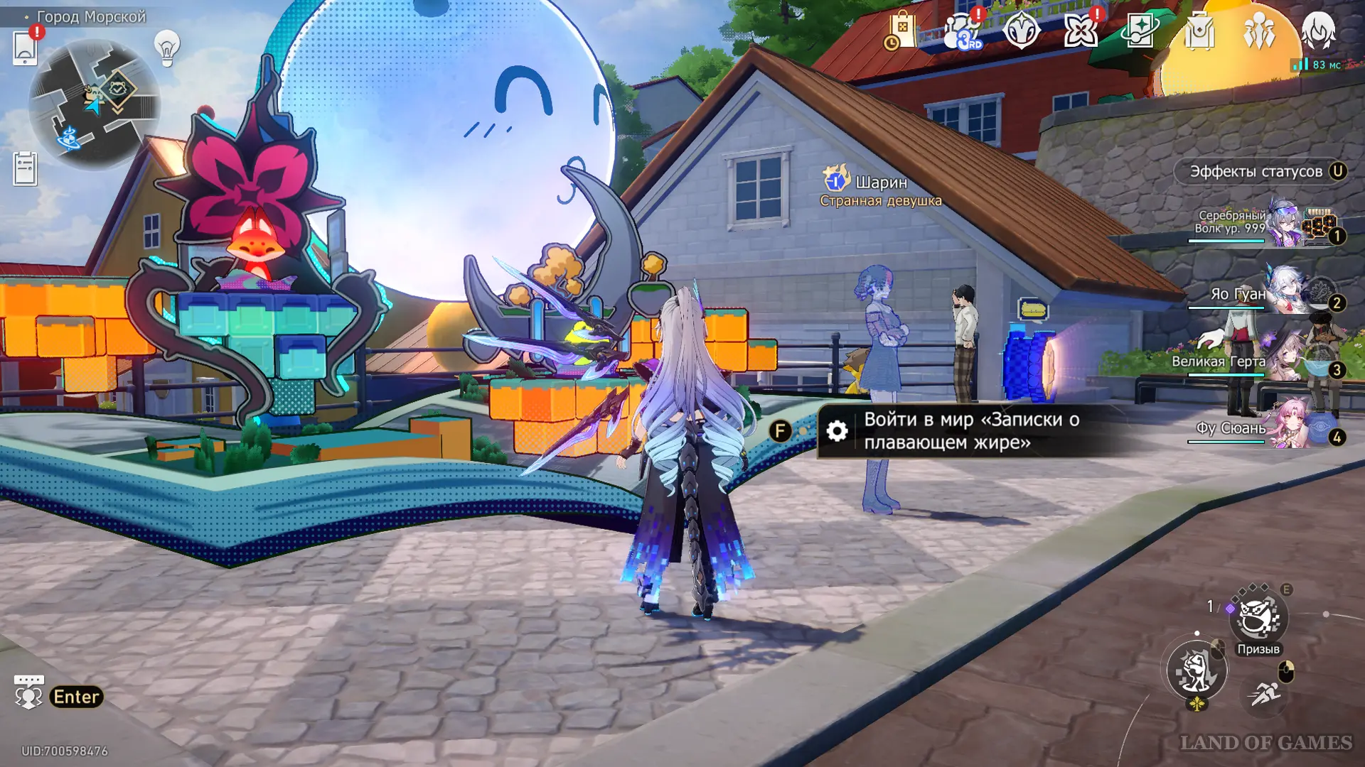 После выполнения всех вышеперечисленных испытаний переместитесь к Миру «Записки о плавающем жире» – он развернулся прямо перед Резиденцией мэра в Городе Морской, а заведует им стоящая рядом голограмма по имени Шарин.