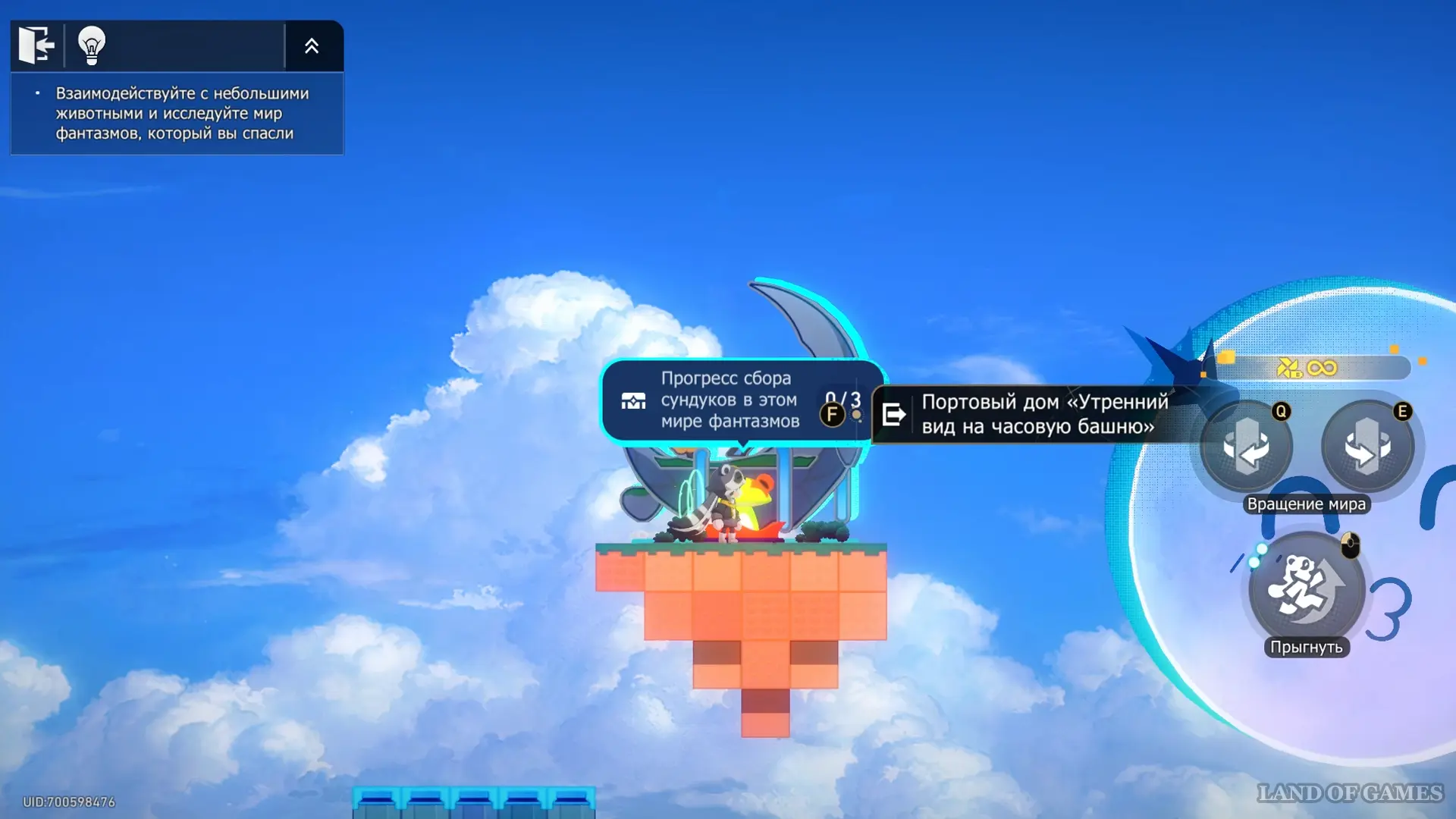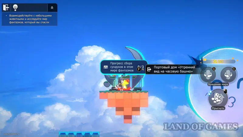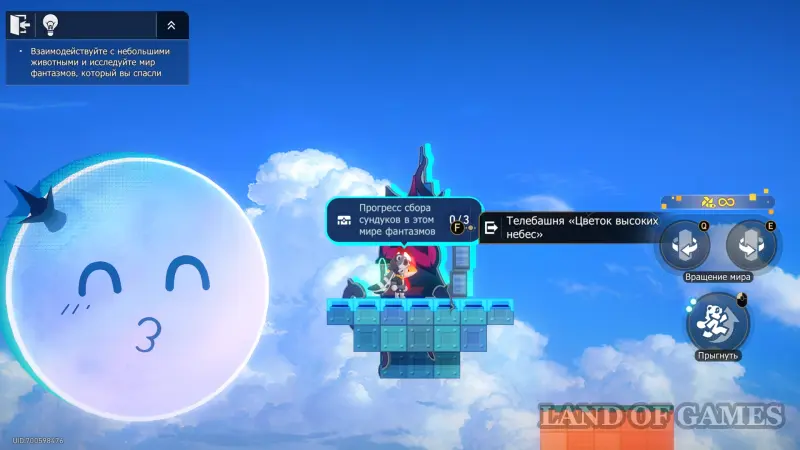 - На башне нажмите один раз E и прыгайте на блок-облако, которое появится сверху-справа;
