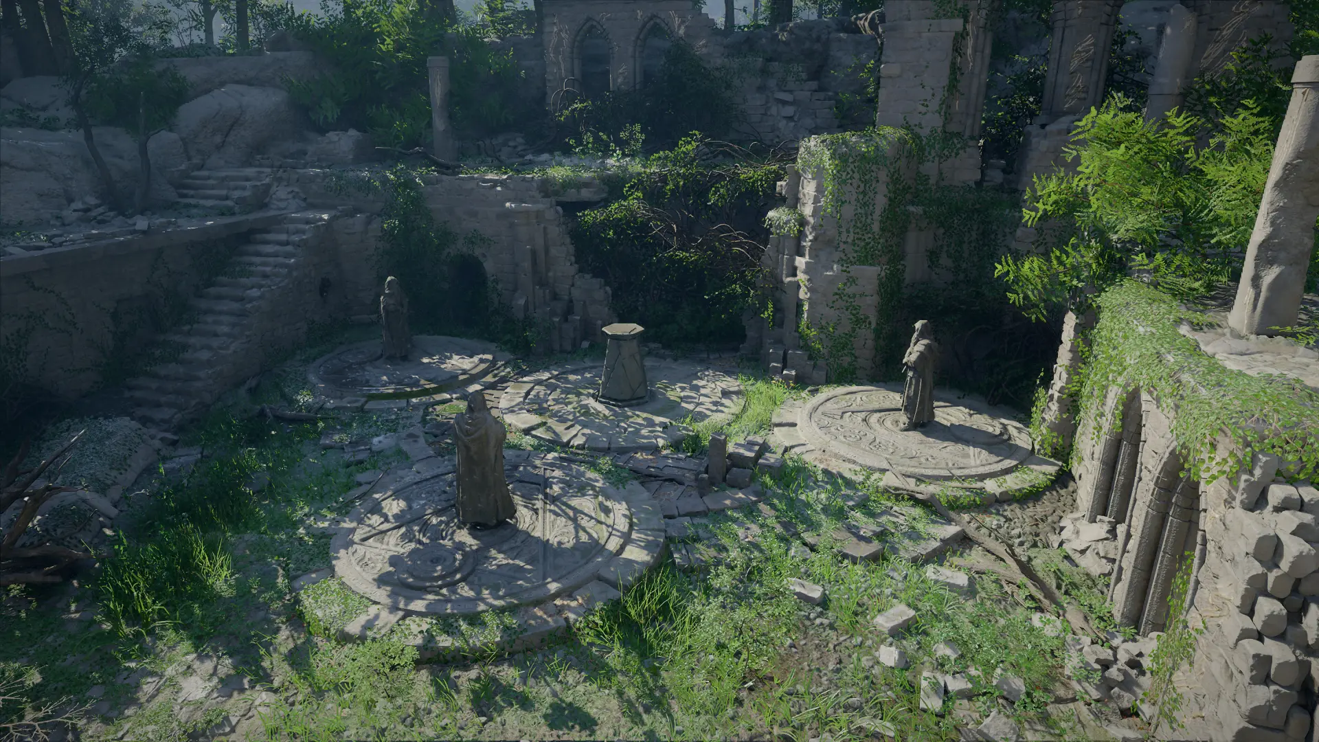 Подойдите к статуе в центре и начните ее вращать. Она связана с четвертой статуей, той самой, что была скрыта за лианами. При повороте центральной фигуры изменяется положение сразу двух элементов.