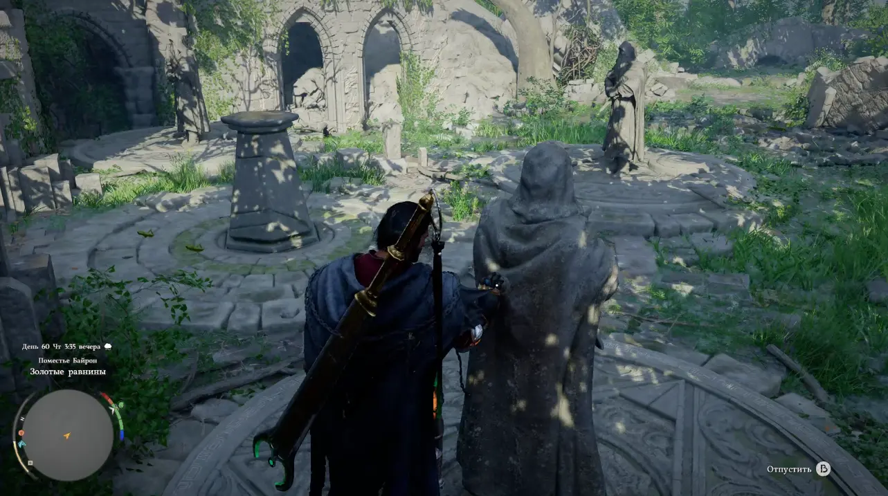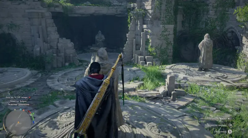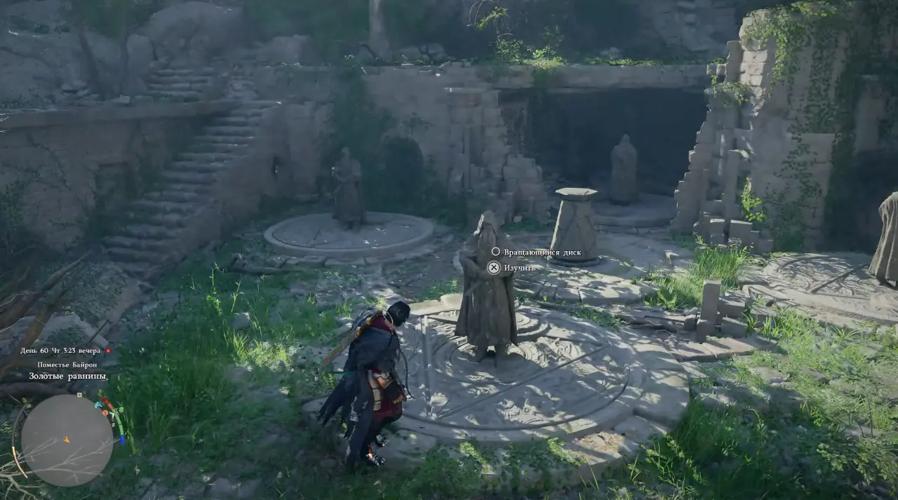 После этого переходите к левой статуе. Она также связана с другим изваянием, которое двигается синхронно. Поворачивайте ее до тех пор, пока обе статуи не окажутся направлены к центру. Как и в предыдущем случае, ориентируйтесь на звук и положение диска под фигурой.