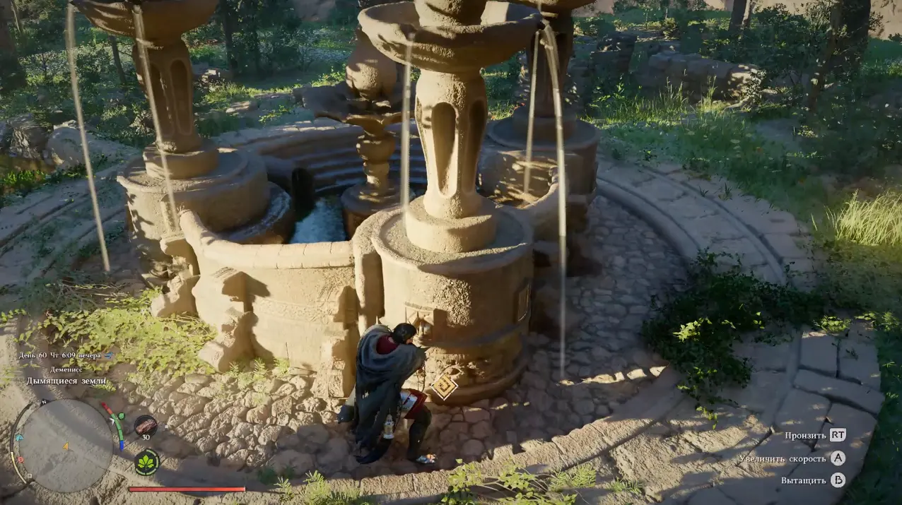 На площадке вы увидите колодец в центре, несколько фонтанов по периметру, а также заросли, которые частично скрывают механизмы.