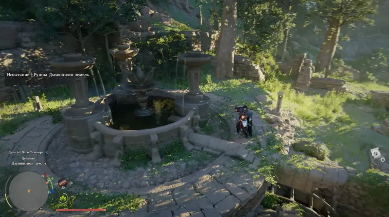 Перед тем как взаимодействовать с механизмами, необходимо убрать лианы и кусты, мешающие доступу к фонтанам. Используйте способность «Отражение света» или огненные аналоги, чтобы сжечь растительность. После этого откроется полный доступ ко всем элементам головоломки.