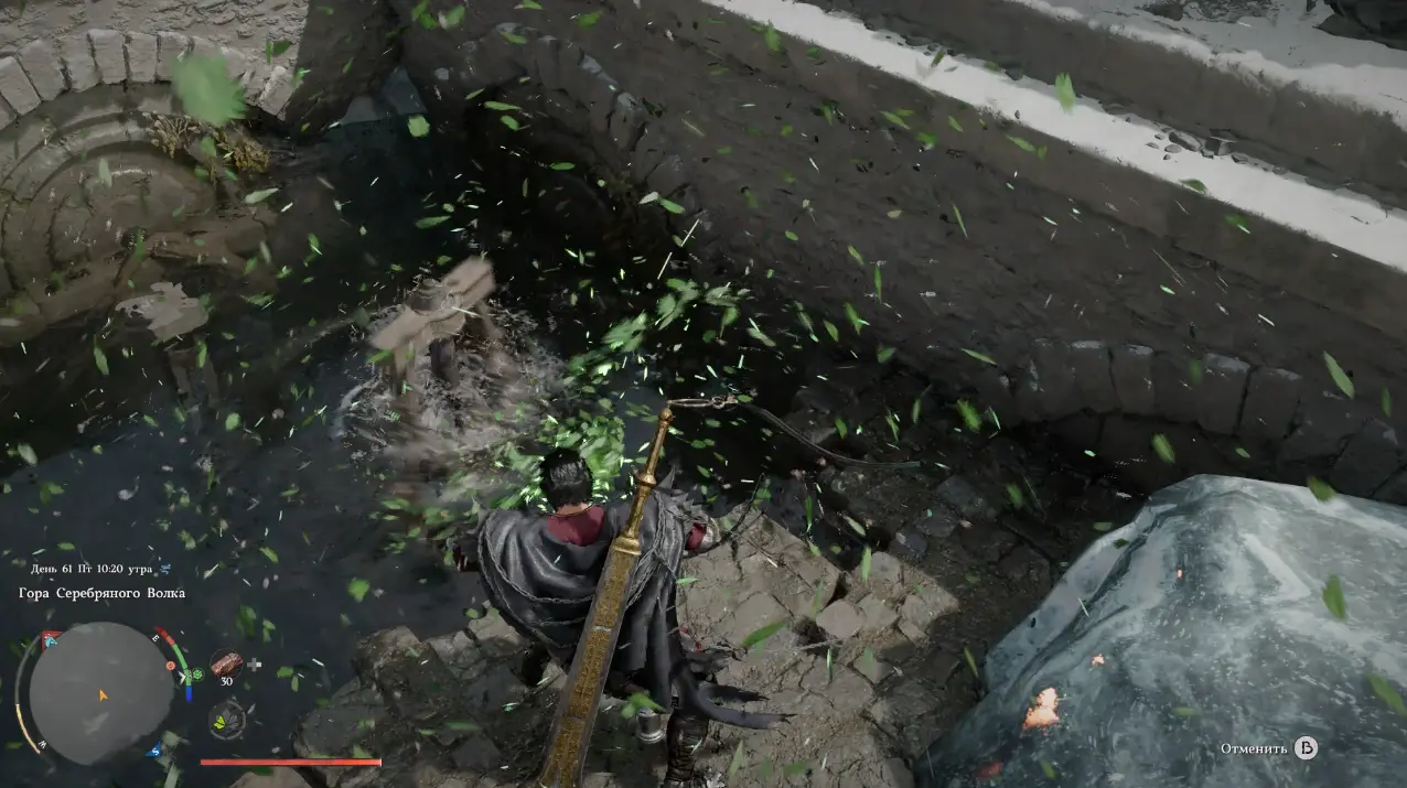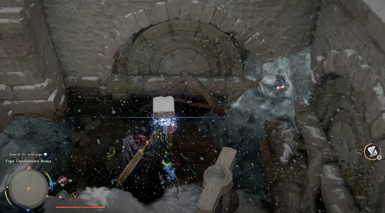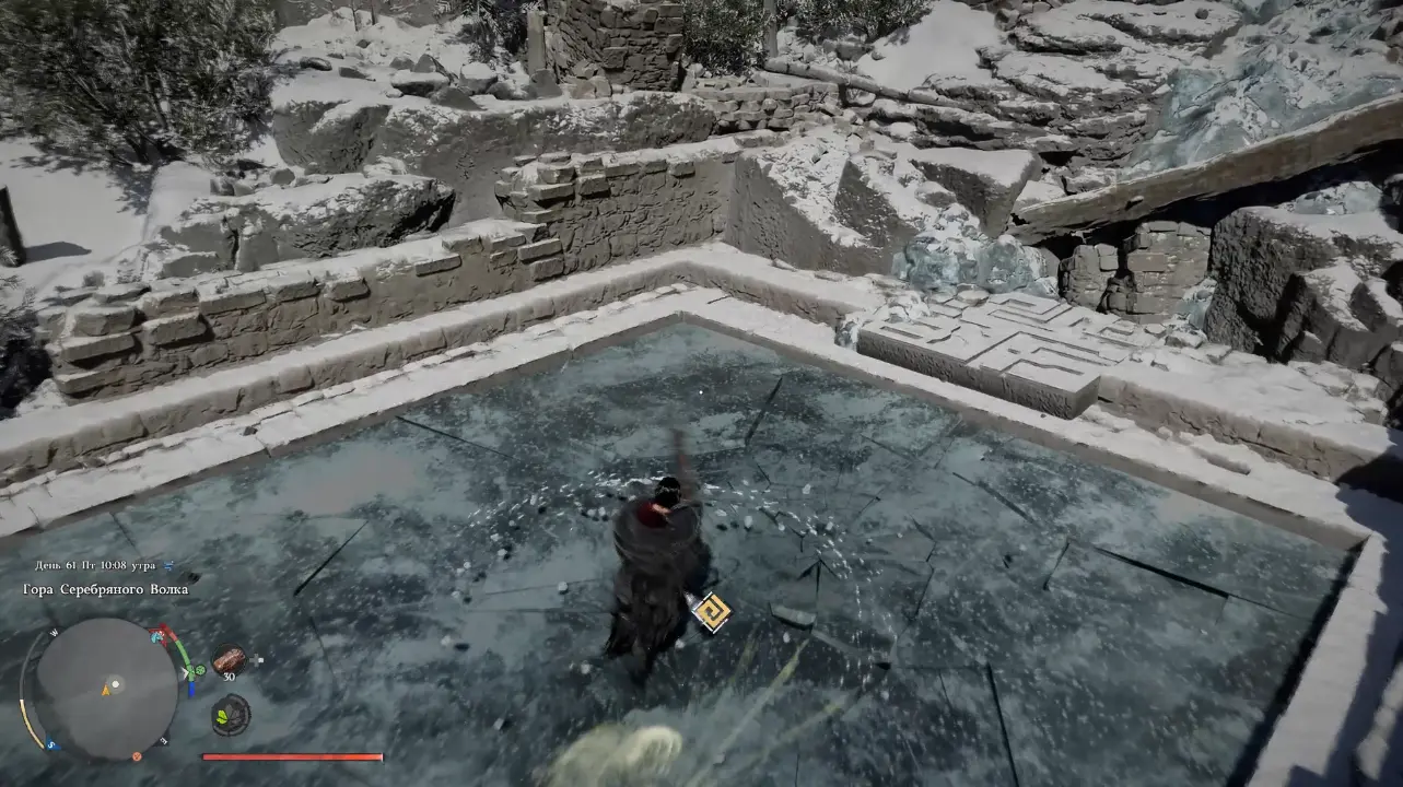 Первое, что нужно сделать, избавиться от ледяной преграды. Встаньте на замерзшую поверхность водоема и используйте мощную атаку. Лед треснет и разрушится, открывая доступ к скрытым под водой механизмам.