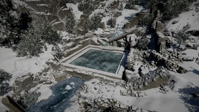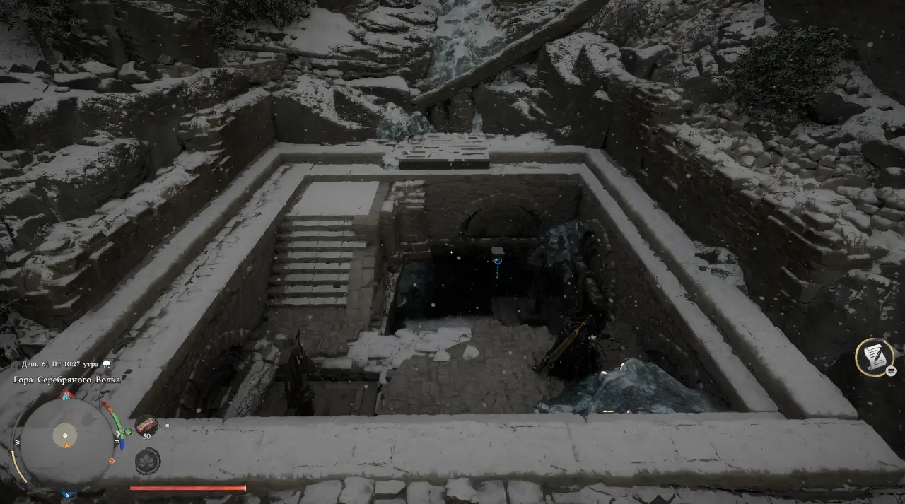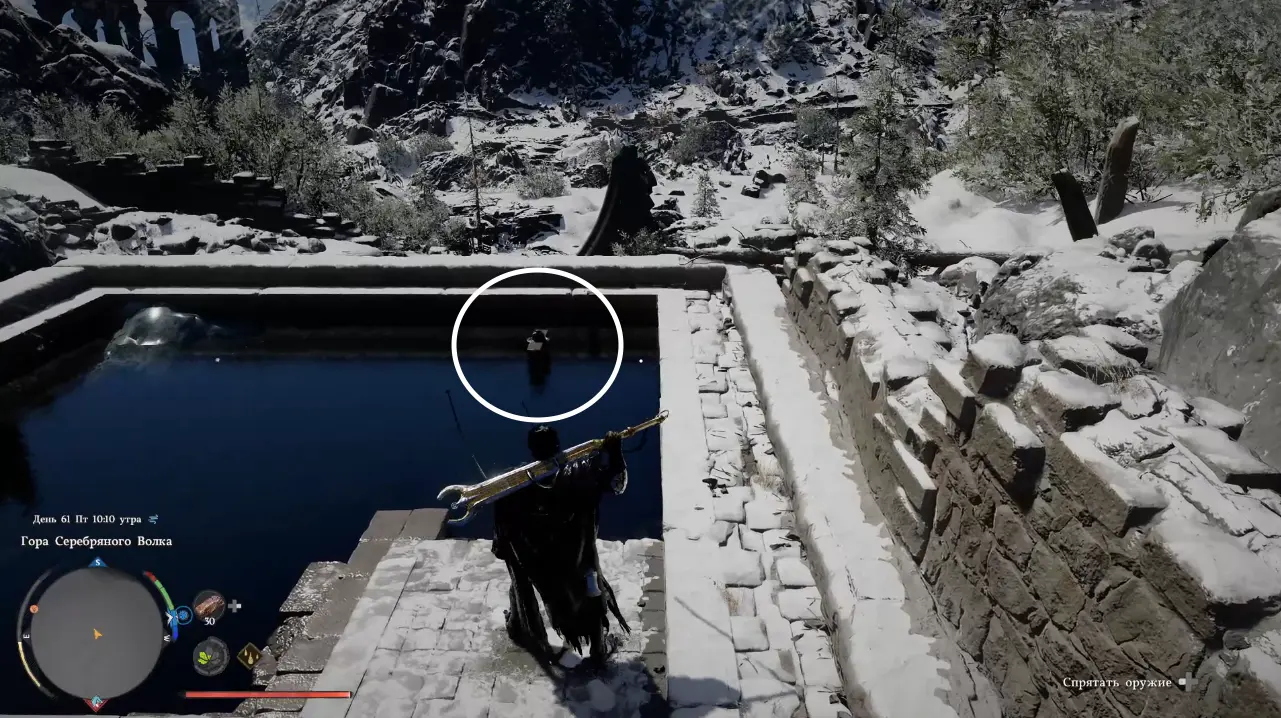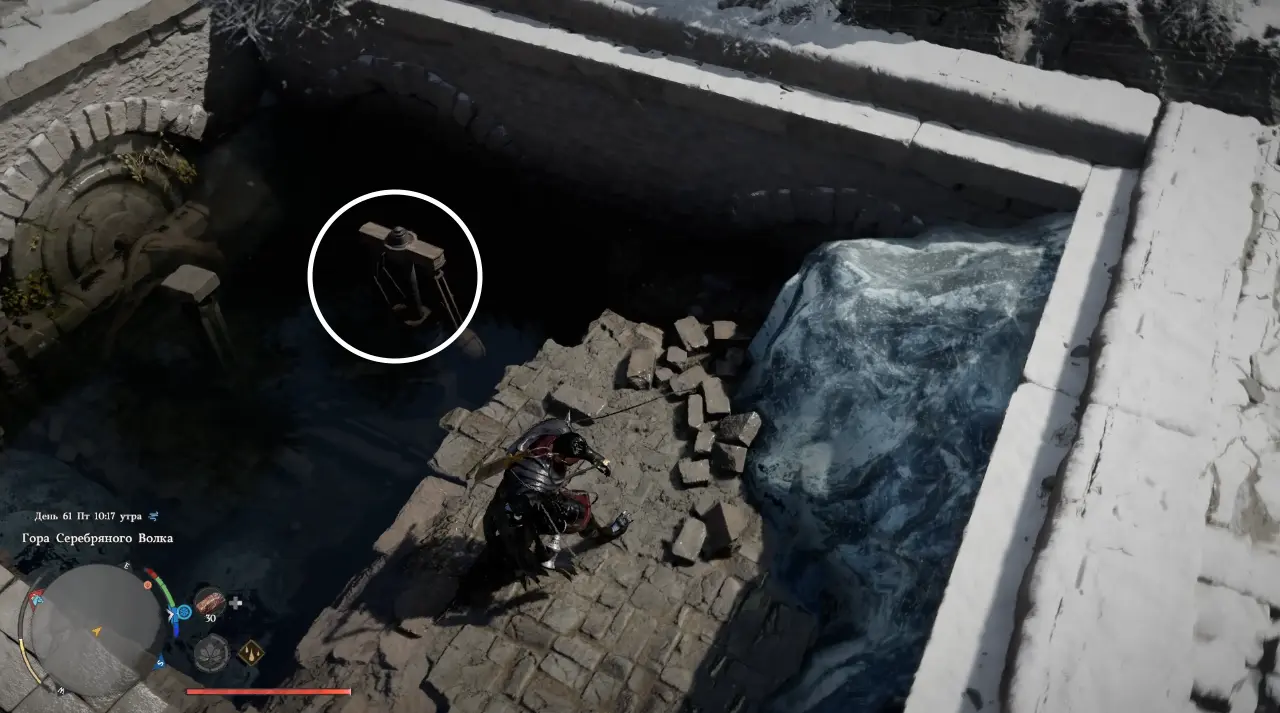 Оказавшись на месте, вы увидите замерзший водоем и лестницу, ведущую к затопленной части руин.