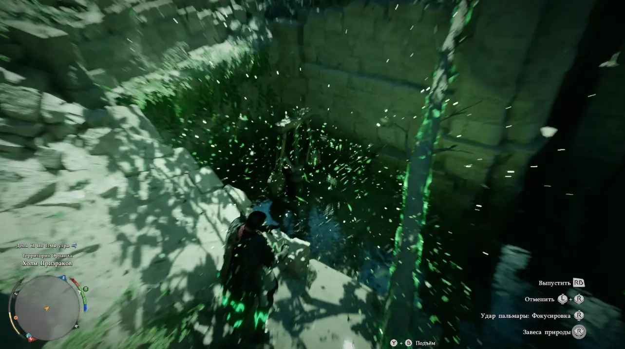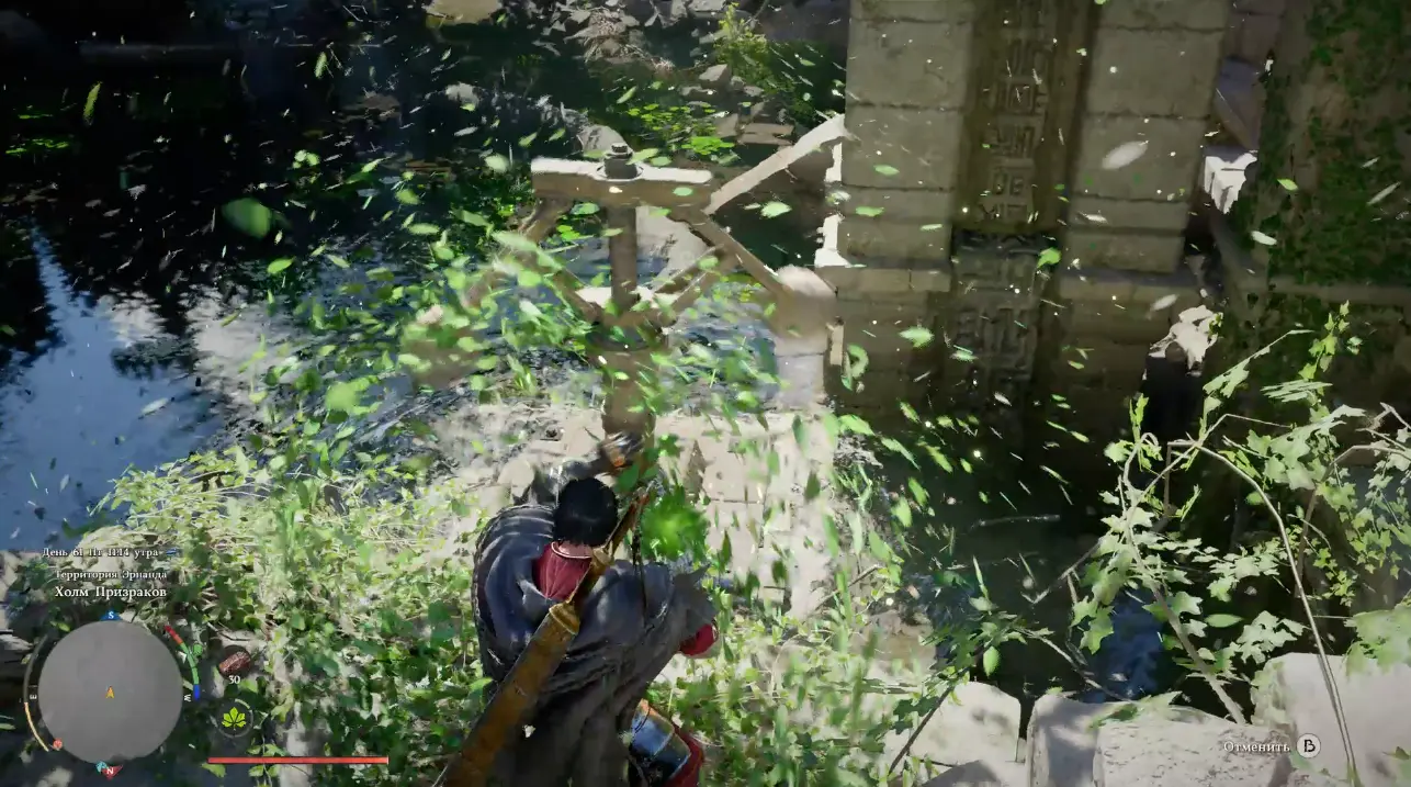 На месте вы обнаружите частично скрытый под водой механизм. Подойдите как можно ближе к этой турбине и активируйте способность «Завеса природы» с фокусировкой. Важно удерживать способность достаточно долго, чтобы воздействовать на опущенный в воду механизм. Постепенно он начнет подниматься, а уровень воды снижаться.