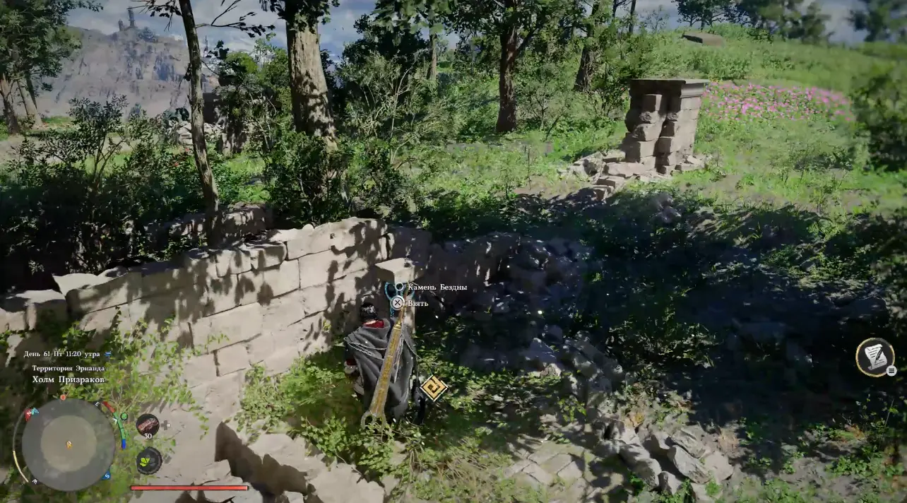 После осушения на склоне, чуть выше первого механизма, появится камень Бездны. Подойдите к нему и взаимодействуйте, чтобы получить награду и открыть точку быстрого перемещения.