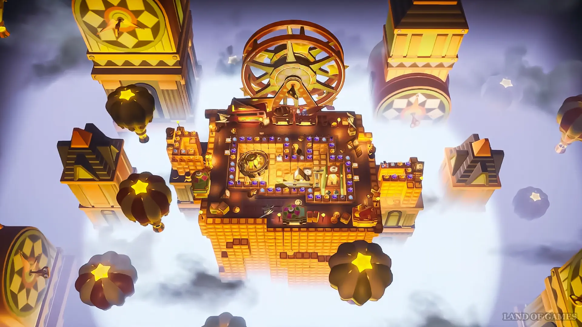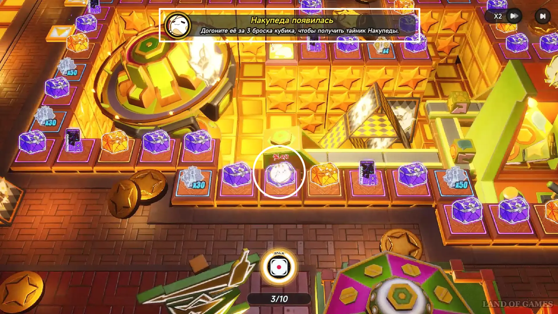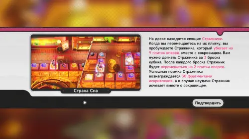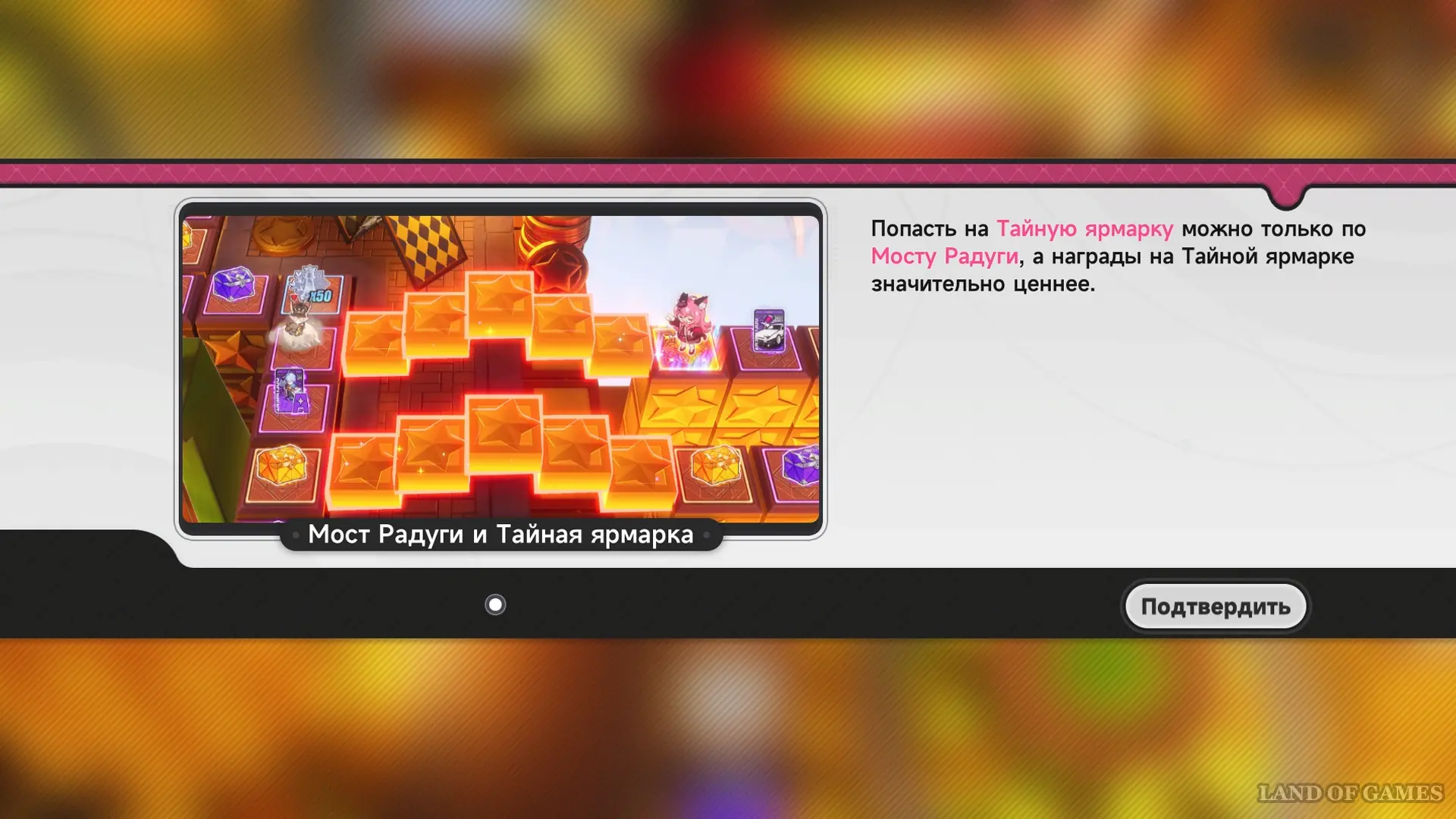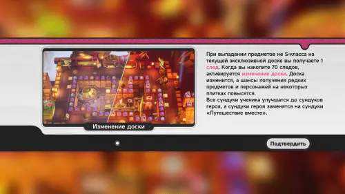 - В левом верхнем углу и по правой половине доски есть области Тайной ярмарки — это секторы с более ценными трофеями (обликами персонажей или транспорта, дополнительными крутками и гарантом на героя). Чтобы попасть в такую область, на кубике должно выпасть число очков, необходимое для приземления на клетку входа со стрелочкой (Мост Радуги).