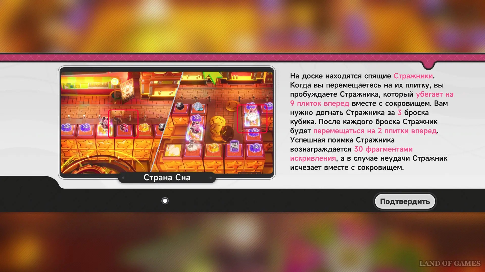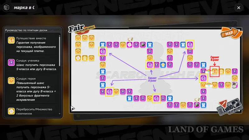 Находясь на доске, нажмите на значок с тремя точками (нижний левый угол) и откройте «Руководство по плиткам доски». Там можно ознакомиться со списком всех доступных событий и наград, которые выпадают при бросках кубика.