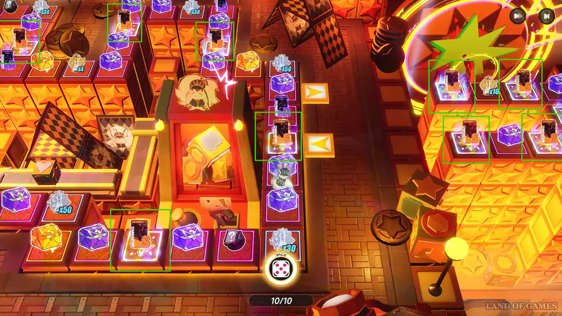 - Центральная часть поля представляет собой замкнутый цикл из 54 клеток, где в подавляющем большинстве встречаются фиолетовые сундуки ученика и золотые сундуки героя. Оба типа боксов могут содержать легендарного персонажа, но с разной вероятностью успеха: если в фиолетовых сундуках шанс составляет всего 0,2%, то в золотых он возрастает до 3%.