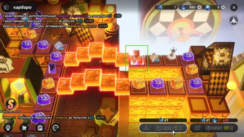 Как только счетчик бросков переваливает за 70, доска меняется, а количество плиток с S-ранговым героем сильно увеличивается — так активируется софт гарант баннера. Изменения сохраняются до дропа легендарного персонажа (вплоть до 90-й крутки).