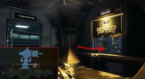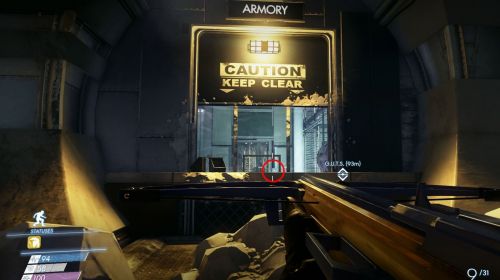 - Как найти: Если вы решили убить заключенного в Лаборатории психотроники, чтобы получить материалы, то вам потребуется воспользоваться другим способом для попадания в оружейный склад. К счастью, такой путь есть. Наведите камеру на окно арсенала – вам нужно будет снести гипсовую стену. Посмотрите на дверь через окно – рядом с ней находится переключатель. Используйте дротикомет, чтобы выстрелить в кнопку и открыть дверь.