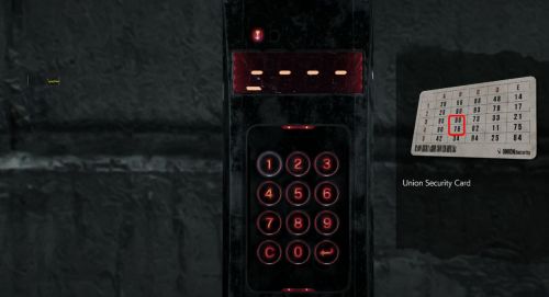 Для открытия двери вам понадобится четырехзначный код доступа. Подсказкой к нему является карточка безопасности Юниона, которая демонстрирует сетку комбинаций аутентификации для безопасных мест Мебиуса (Mobius). Вы можете найти ее на мертвом теле, принадлежащем солдату и расположенном неподалеку от двери. Рядом с трупом стоят две зеленые бочки. Когда вы получите карту, подойдите к панели доступа и взаимодействуйте с ней. Себастьян достанет карточку и вы сможете рассмотреть сетку кодов.